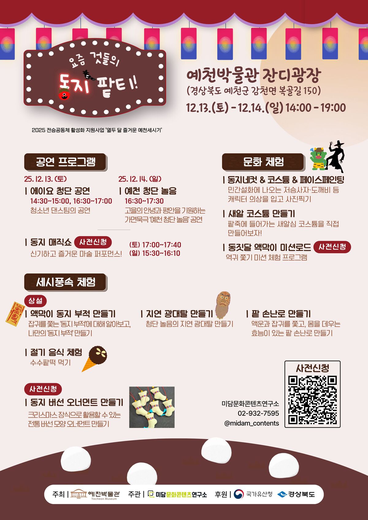 예천박물관은 동지 풍속에 담긴 의미를 체험과 놀이로 풀어낸 문화행사 ‘요즘 것들의 동지 팥티’를 오는 13일부터 14일까지 운영한다.