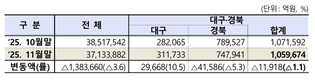 9일 한국거래소 대구혁신성장센터가 발표한 ‘2025년 11월말 대구·경북 상장사 증시 동향’에 따르면지역 내 123개 상장사의 시가총액은 105조 9674억 원으로 한 달 사이 1조 1918억원(1.1%) 줄었다.