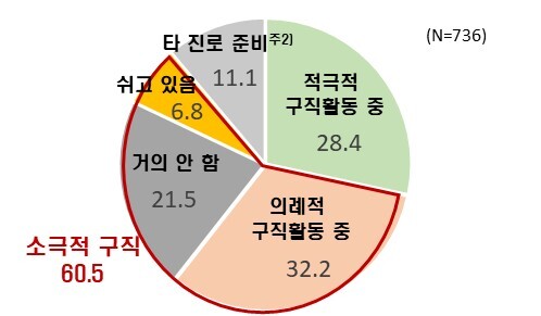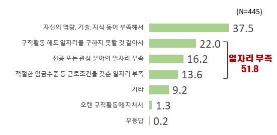 소극적 구직 사유 중 가장 높은 비중을 차지한 응답은 역량·기술·지식 부족(37.5%)이었다. 이어 구직해도 일자리를 못 구할 것 같다(22.0%), 전공·관심 일자리 부족(16.2%), 적정 임금·근로조건을 갖춘 일자리 부족(13.6%) 순으로 나타났다.