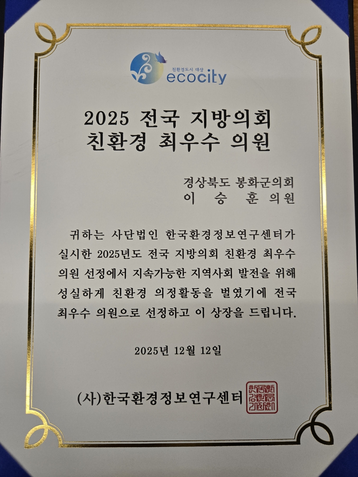 봉화군의회 이승훈 의원이 (사)한국환경정보연구센터가 주관한 ‘2025 전국지방의회 친환경 최우수 의원 공모’에서 최종 수상자에 선정됐다.
