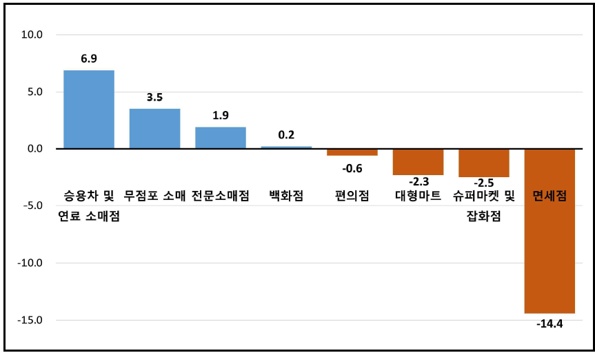 유통 업태별로는 승용차·연료 소매점과 무점포 소매가 각각 6.9%, 3.5% 증가한 반면 면세점(-14.4%), 대형마트(-2.3%), 슈퍼마켓·잡화점(-2.5%) 등 오프라인 유통은 부진을 면치 못했다