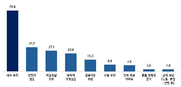 올해 경영난의 주요 원인(복수응답)으로는 ‘내수 부진’이 79.8%로 가장 많았다. 이어 ‘인건비 상승’(31.7%), ‘자금조달 곤란’(27.1%), ‘원자재 가격 상승’(23.6%) 등이 뒤를 이었다.
