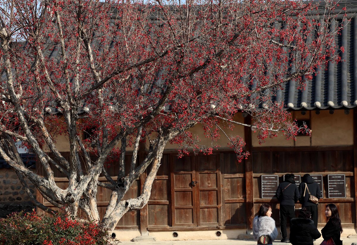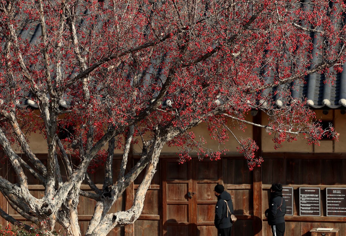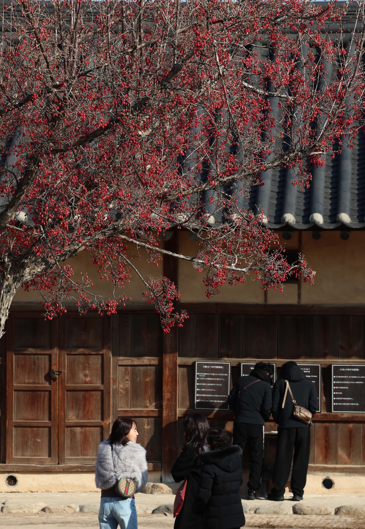 17일 오전 경주 교촌 한옥마을에 있는 최부자댁 정원 산수유 나무에 가득 열린 산수유 열매가 한옥의 정취를 더하고 있다. /이용선기자 photokid@kbmaeil.com