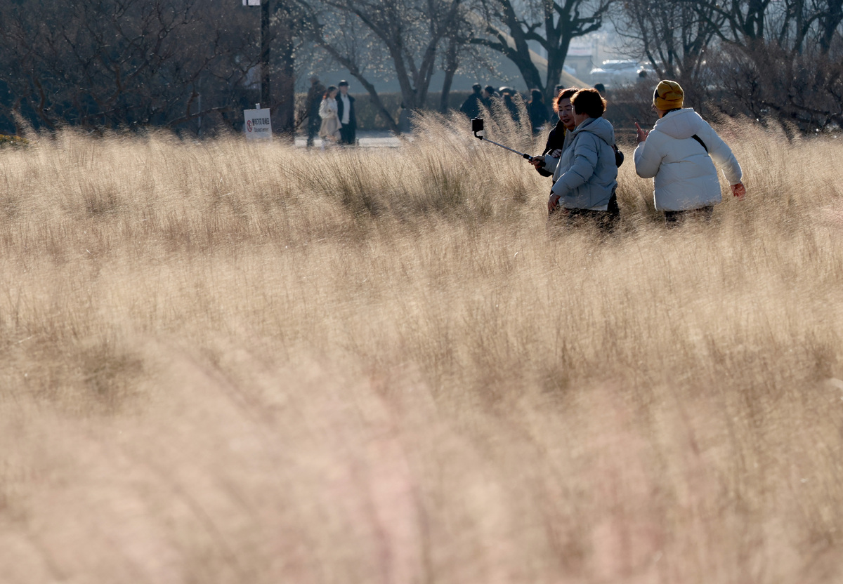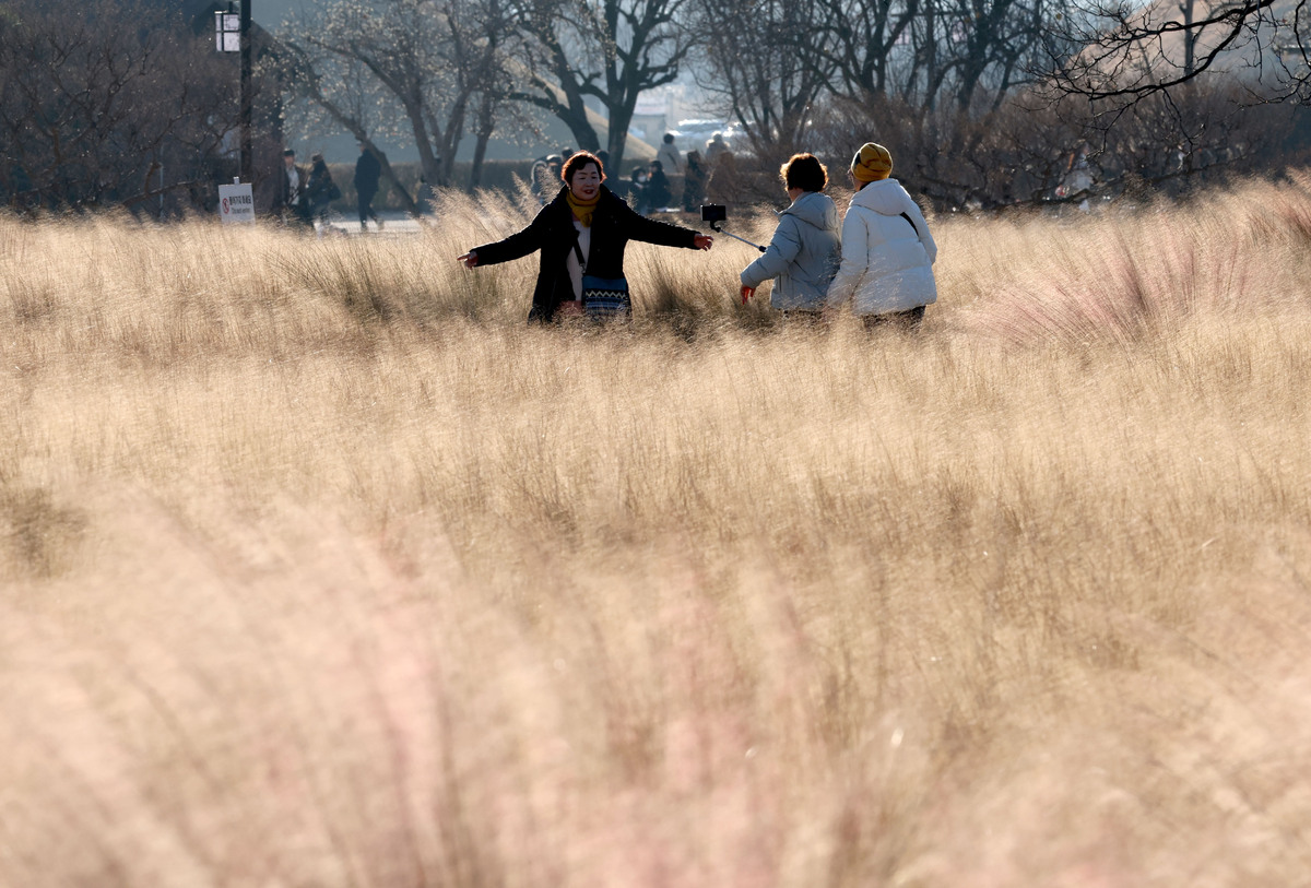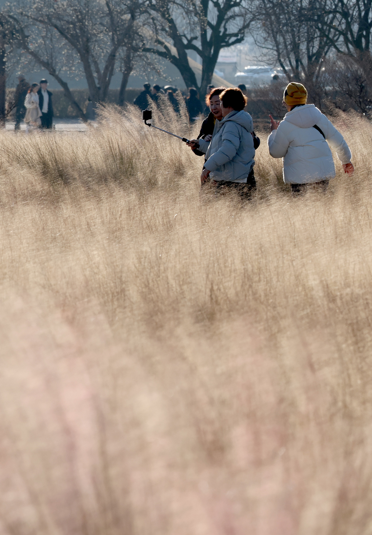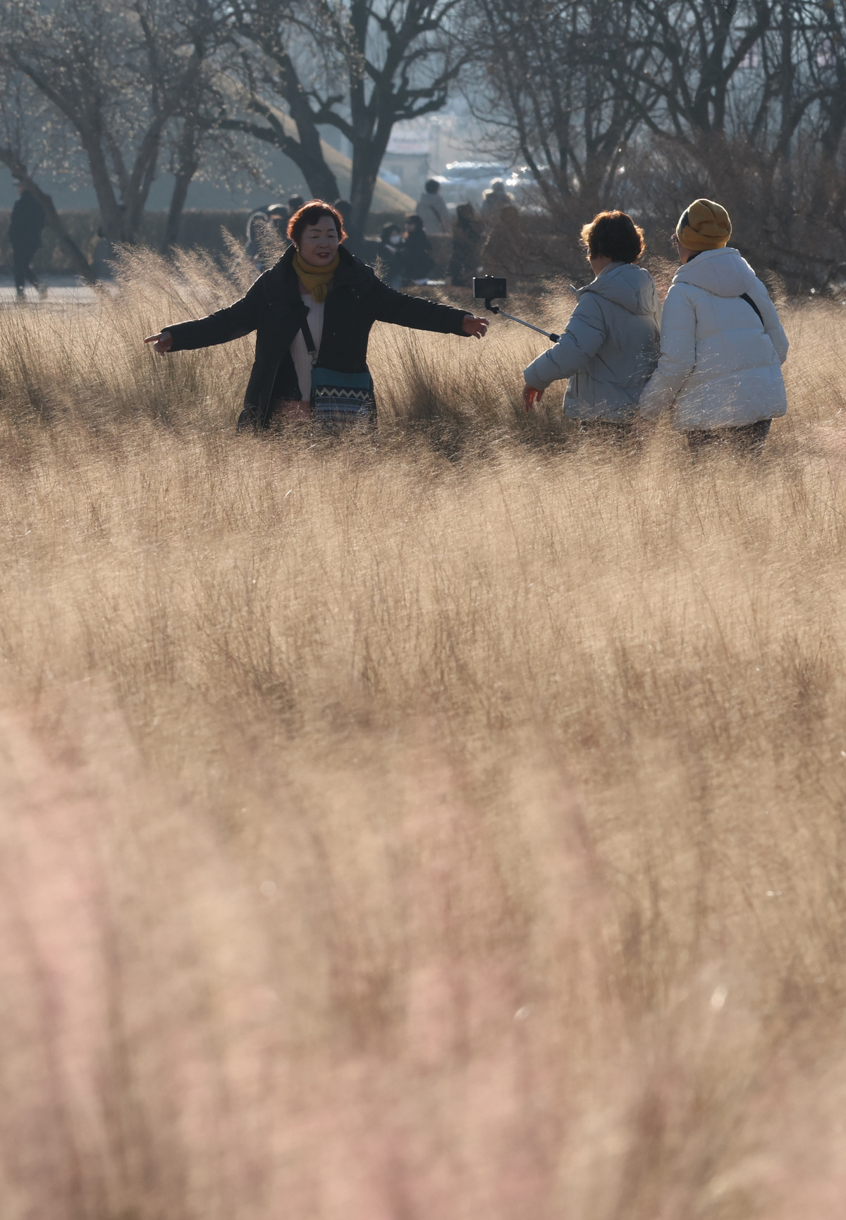 18일 오후 경주를 찾은 관광객들이 첨성대 인근의 핑크뮬리 군락지를 산책하고 있다. 핑크뮬리는 겨울에는 분홍색이 빠져서 갈대 같은 느낌을 준다. /이용선기자 photokid@kbameil.com