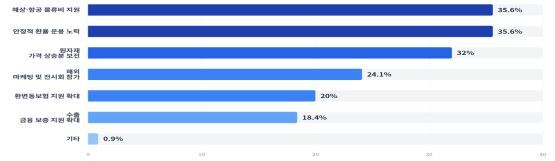 고환율 국면에서 가장 필요한 정부 지원으로는 ‘환율 안정 노력’(35.6%)과 ‘해상·항공 물류비 지원’(35.6%), ‘원자재 가격 상승분 보전’(32.0%)이 지목됐다.