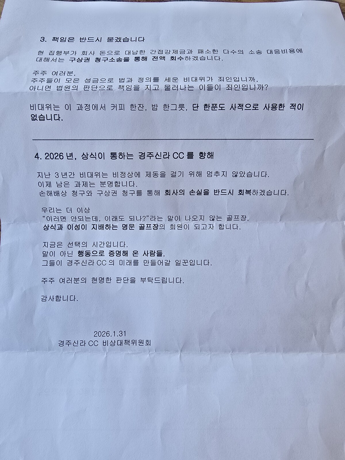 다수 회원들은 이번 회장단 선거가 신라CC의 향후 운영 방향을 결정하는 중대한 분기점으로 보고 있다. 그러나 현재의 상황은 ‘정상화’ 논쟁을 넘어 선거 자체의 공정성과 신뢰를 훼손하는 방향으로 흘러 우려의 목소리가 높다. 이들은 “이번 선거가 진영 힘 싸움으로 가면 신라CC의 진정한 정상화는 요원해진다"면서 “불법 선거 행위는 당연 중단해야겠지만 선관위도 선거결과를 신뢰받기 위해서는 보다 강력하게 개입, 불법을 엄단하는 등 선거질서를 바로 잡아야 한다"고 지적했다.