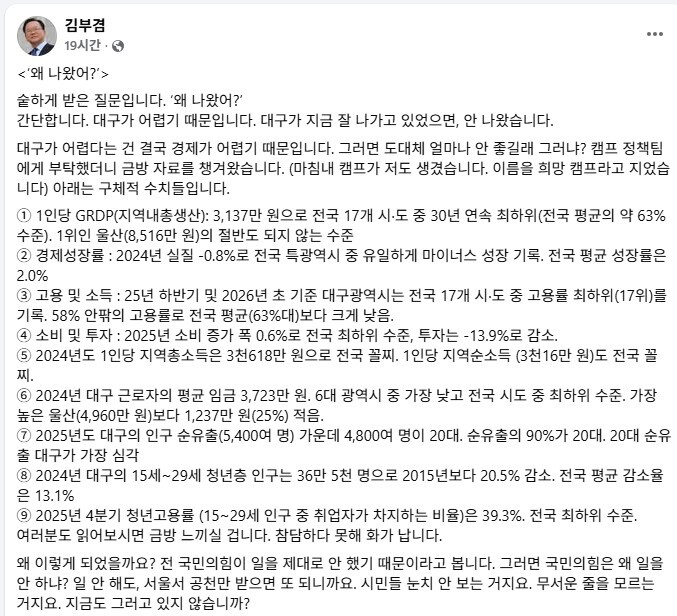 그는 대구의 경제 상황에 대해 구체적인 수치를 제시하며 위기의 심각성을 강조하기도 했다. 1인당 지역내총생산(GRDP)은 3137만 원으로 30년 연속 전국 최하위 수준이며, 경제성장률도 2024년 기준 -0.8%로 광역시 중 유일하게 마이너스를 기록했다고 설명했다. 또 고용률, 임금, 소비·투자, 지역총소득 등 주요 지표 역시 전국 최하위권에 머물고 있다고 했다.