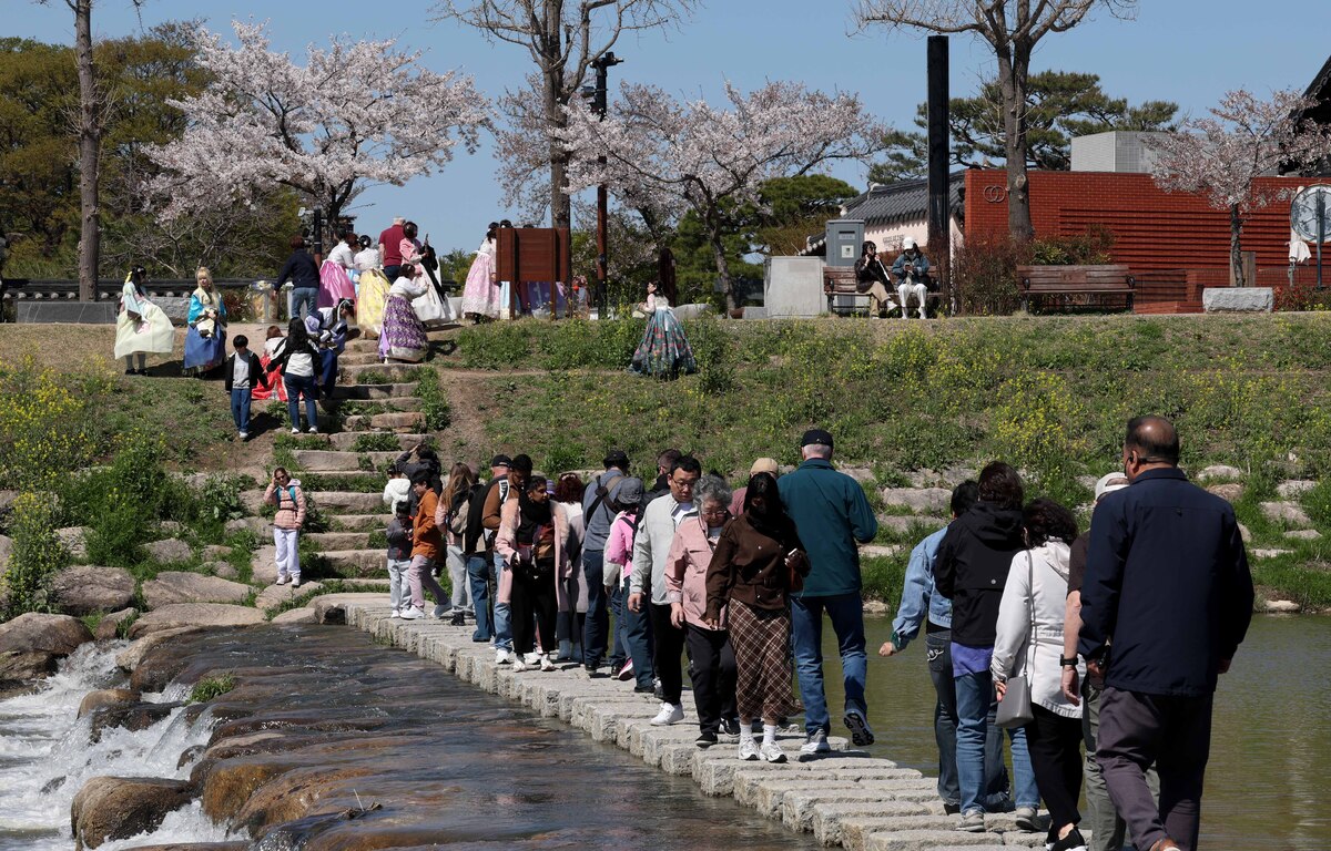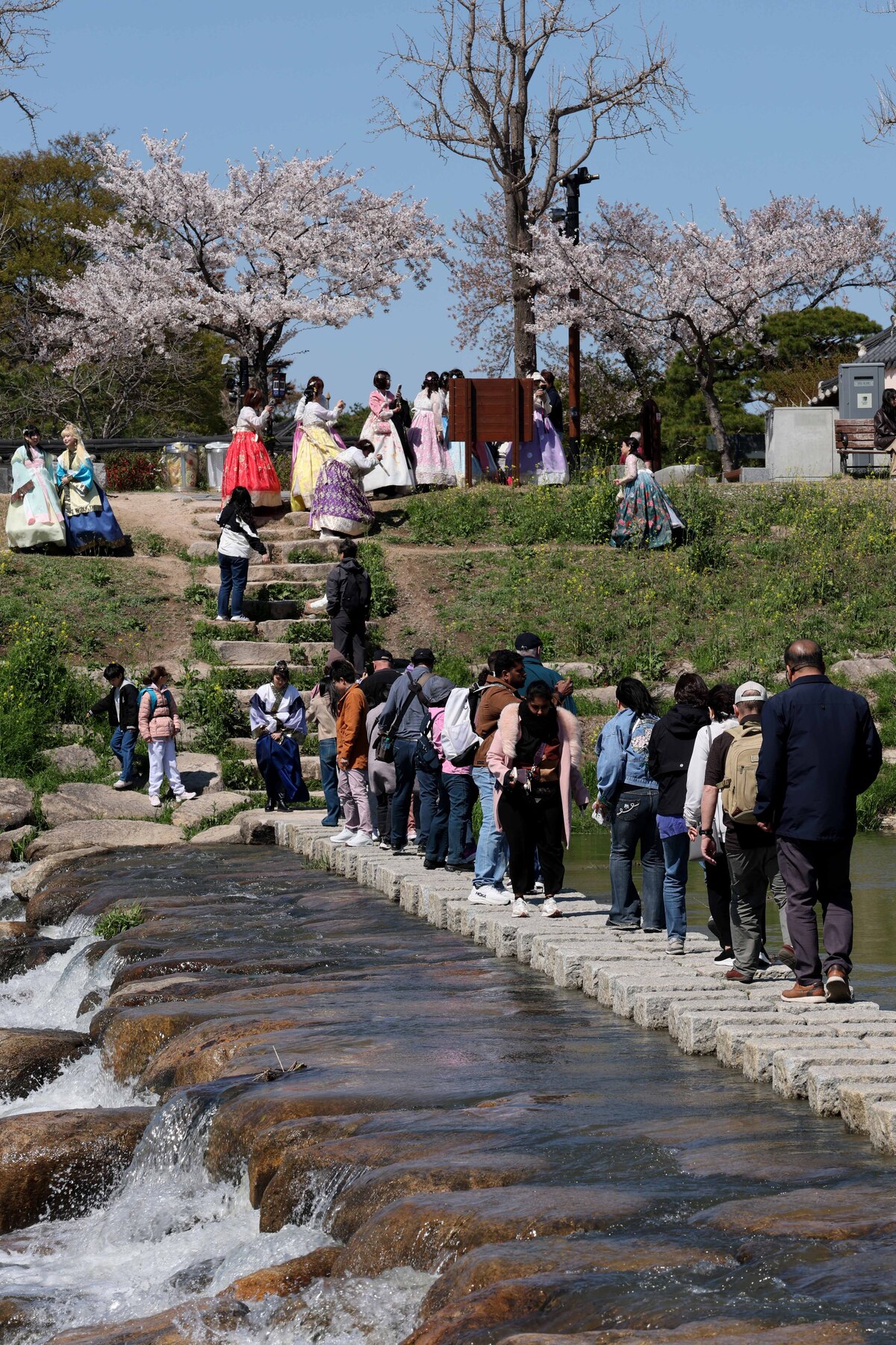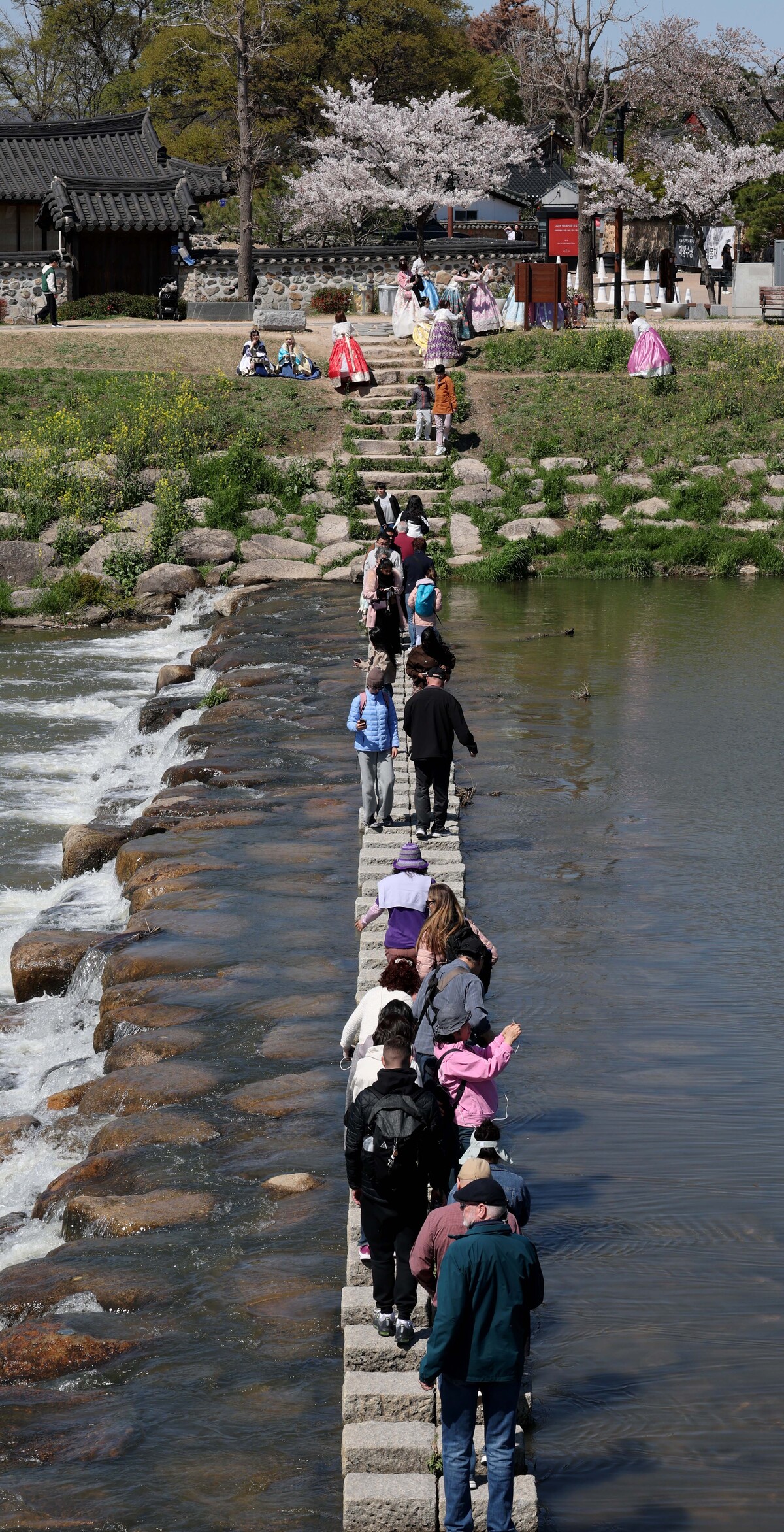경주 지역 낮 최고 기온이 14.7℃를 기록하며 쾌청한 봄 날씨를 보인 7일 오후 교촌 한옥마을을 찾은 외국 관광객들이 월정교 징검다리에서 한국의 봄을 즐기고 있다. /이용선기자 photokid@kbmaeil.com