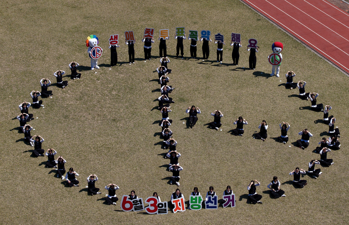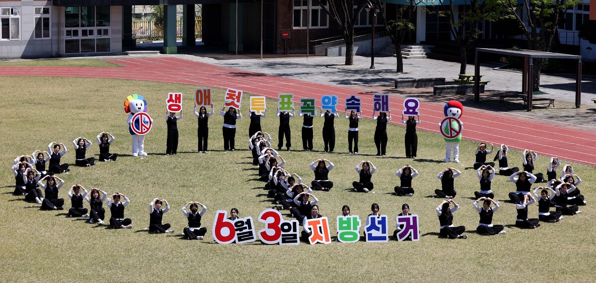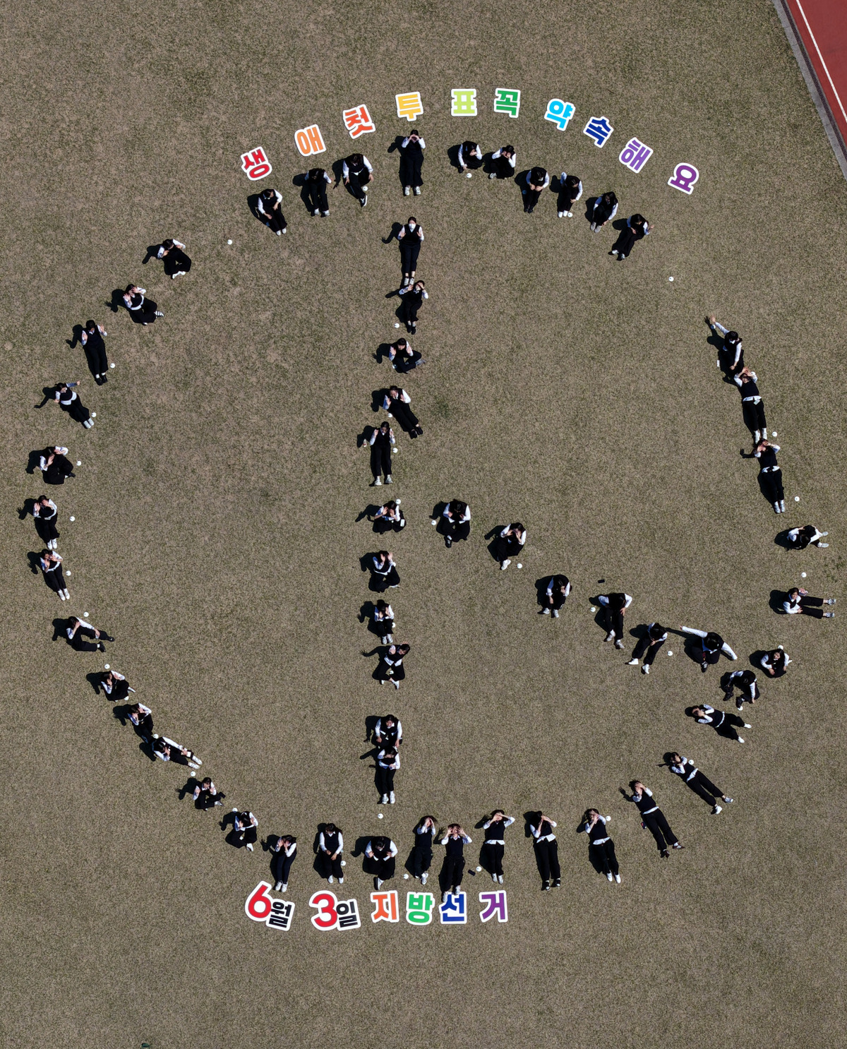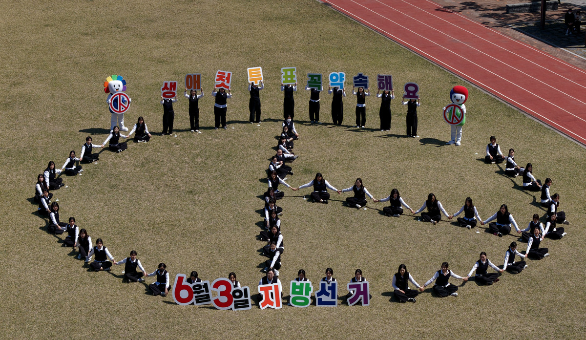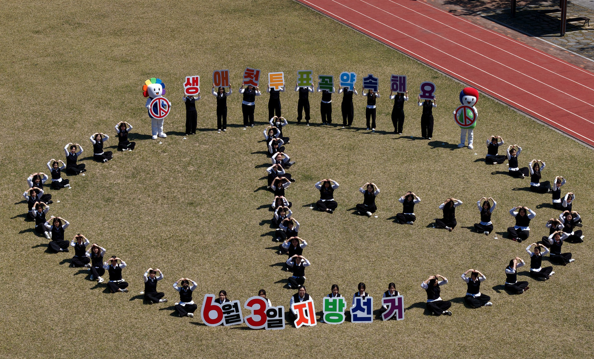 8일 오후 대구시 서구 중리동 경덕여고 운동장에서 대구시 선거관리위원회와 새내기 유권자인 경덕여고 3학년 학생들이 생애 첫 투표 참여 캠페인을 하고 있다. /이용선기자 photokid@kbmaeil.com