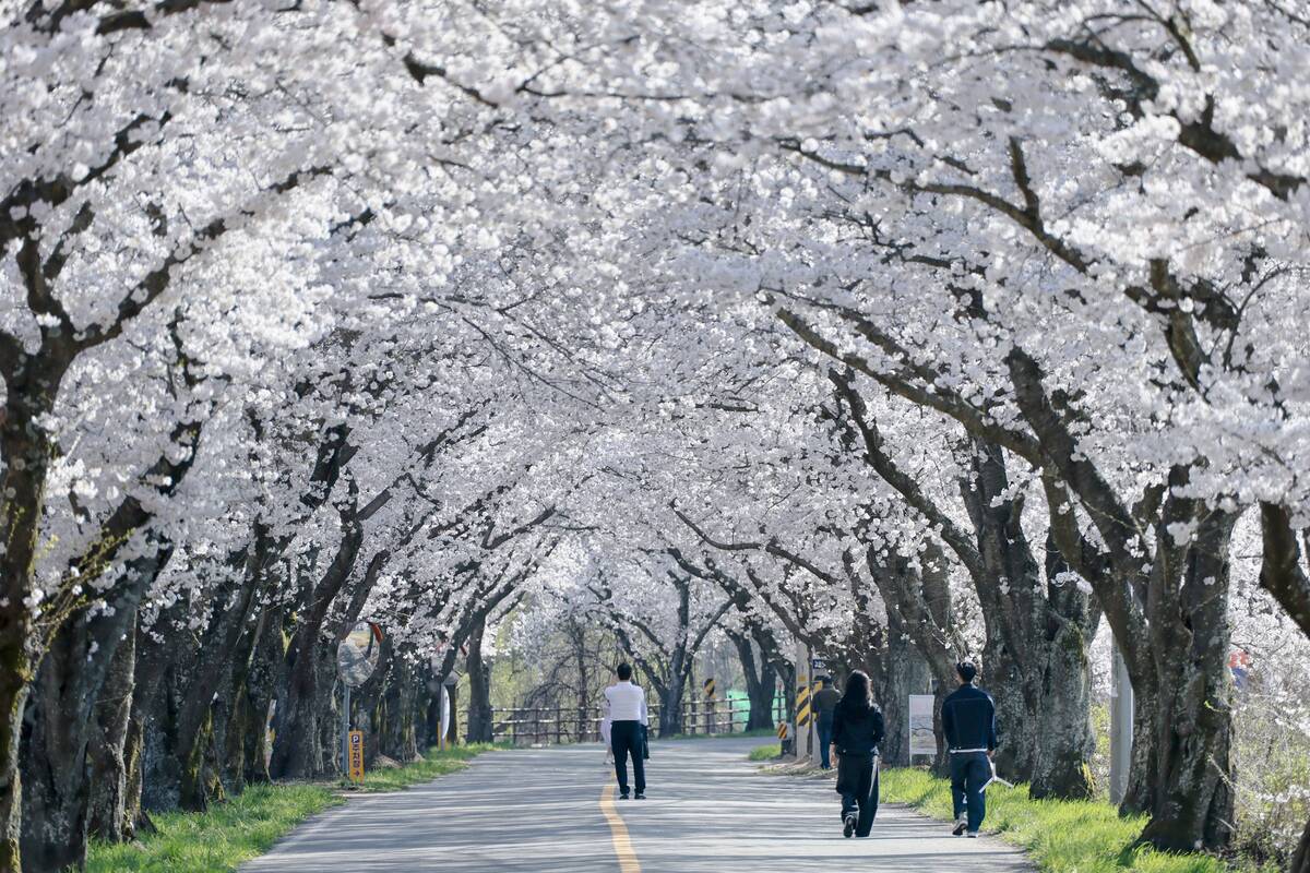 경주 암곡동 일원에 도심보다 늦게 피는 ‘벚꽃 터널’이 절정을 이루며 봄을 붙잡고 있다.