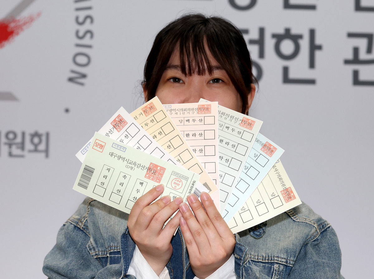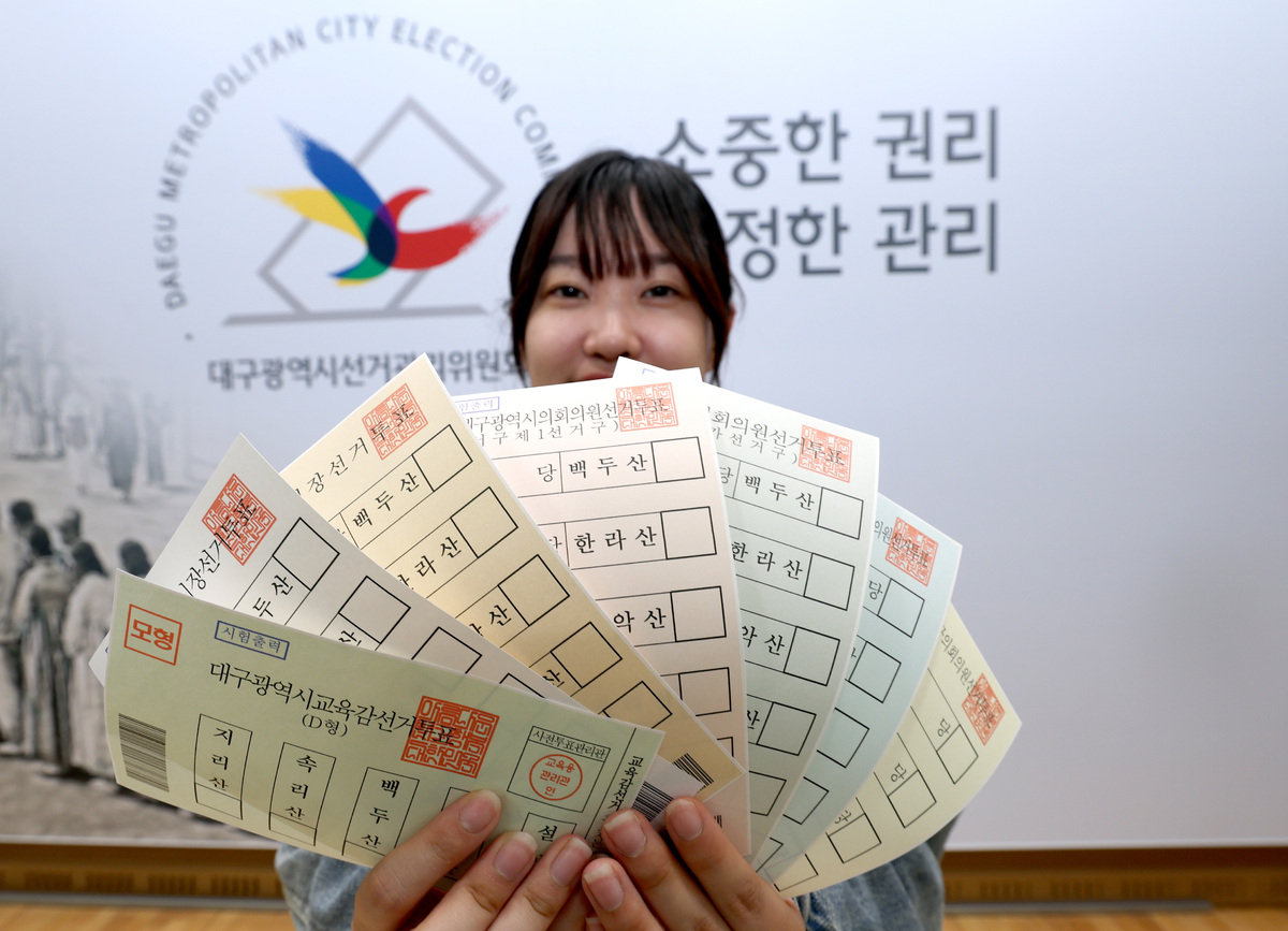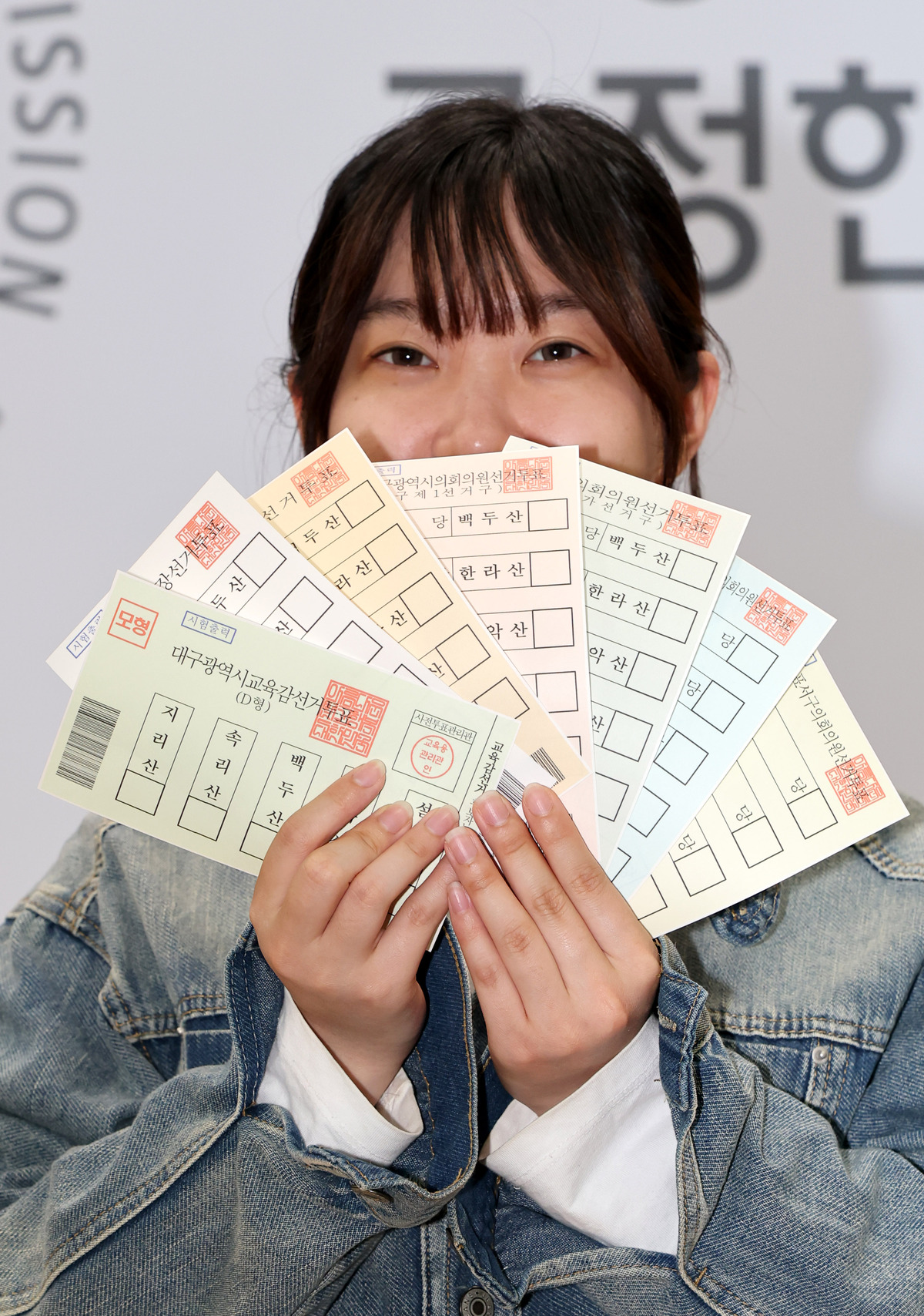 제9회 전국동시지방선거를 48일 앞둔 16일 오후 대구시 선관위 관계자가 교육과정에서 출력한 모형 투표용지를 들어 보이고 있다. 6·3 전국동시지방선거에서는 유권자가 7장(1.광역단체장, 2.기초단체장, 3. 교육감, 4. 지역구 광역의원, 5. 지역구 기초의원, 6. 비례대표 광역의원, 7. 비례대표 기초의원)의 투표용지를 받아 기표하게 된다. /이용선기자photokid@kbmaeil.com