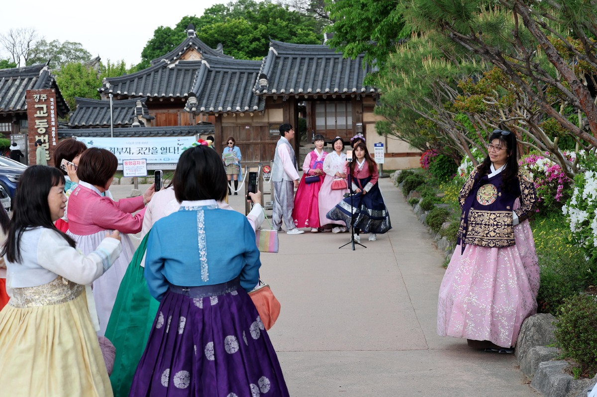 20일 오후 경주를 찾은 외국 관광객들이 한복을 곱게 차려 입고 교촌 한옥마을에서 한국 관광의 추억을 카메라에 담고 있다. /이용선기자 photokid@kbmaeil.com