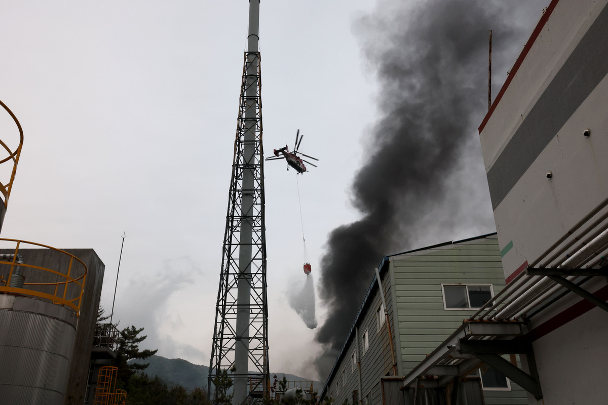 28일 오후 5시5분쯤 경주시 건천읍 산업단지에 있는 폐비닐 및 폐플라스틱 열분해유 제조공장에서 용접 부주의로 추정되는 화재가 발생했다. 경주시 임차 헬기가 진화작업을 하고 있다. /이용선기자 photokid@kbmaeil.com
