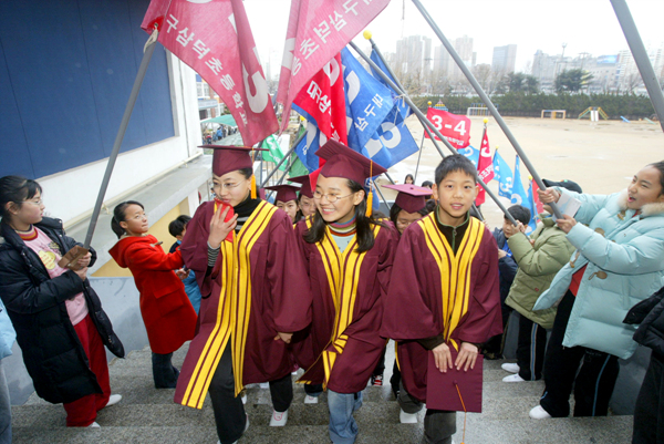 16일 오전 대구삼덕초등학교에서 졸업가운을 입은 졸업생들이 재학생들의 환영을 받으며 졸업식장으로 입장하고 있다 . 올해 처음으로 입은 졸업가운은 후배들에게 대물림 된다 /김낙현기자 kimrh@kbmaeil.com
