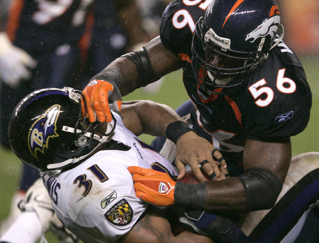 10일(한국시간) 콜로라도 덴베에서 열린 미국프로풋볼 경기중 덴버 브론코스의 라인베커 알 윌슨(56번)이 볼티모어 레이븐스의 러닝백 자말 루이스(31번)에게 태클을 시도하고 있다.