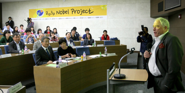 포항시와 아시아태평양 이론물리센터(APCTP)가 공동으로 마련한 `2012 노벨드림캠프`가 3일 오후 포스텍 내 포스코 국제관에서 시작됐다. 2002년 노벨화학상 수상자인 쿠르트 뷔트리히가 과학 꿈나무들에게 과학 중요