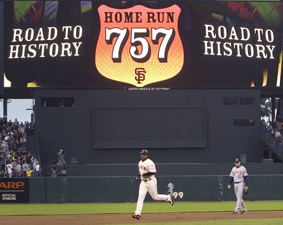 본즈는 9일(한국시간) 캘리포니아주 샌프란시스코 AT&T파크에서 열린 워싱턴 내셔널스와 홈경기에 좌익수 겸 4번타자로 선발 출장, 1회말 2점홈런을 쏘아올려 개인통산 757호를 기록했다.