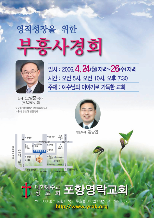 포항시 북구 두호동에 위치한 포항영락교회(담임 김승민목사)는 24일부터 26일까지 교회내 예배당에서 신도들의 영적 각성과 생활쇄신을 도모하기 위한 '영적성장을 위한 부흥사경회'를 갖는다.