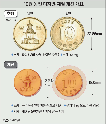 구리가격의 급등으로 현재의 10원 동전 소재 가치는 올해 7월 말 현재 약 24원에 달하지만 새 동전의 소재가치는 액면가격을 크게 밑도는 5-6원 정도가 된다고 한은은 밝혔다.