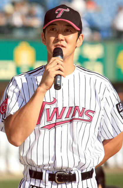 24일 오후 서울 잠실야구장에서 열린 두산 베어스 -LG트윈스 경기를 마지막으로 은퇴하는 LG트윈스 1루수 서용빈이 은퇴사를 하고 있다.