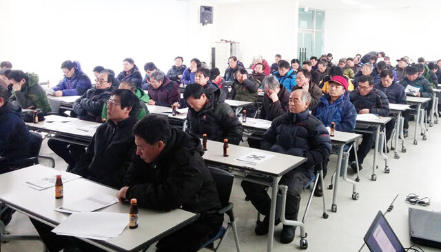 ▲ 울릉한마음회관에서 열린 중국어선 피해대책보고회 모습. 울릉도 어업인들이 진지한 표정으로 설명을 듣고 있다.