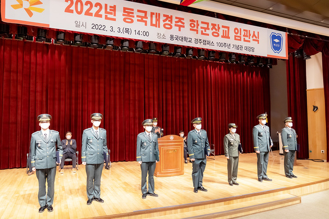 동국대학교 경주캠퍼스(총장 이영경) 제1121 학군사관후보생 29명이 최근 ‘2022년 학군장교 임관식’을 갖고 육군과 해병 소위로 임관했다. <사진>
