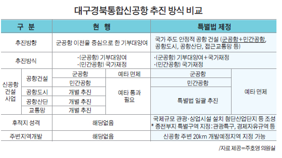 특별법 주요 내용으로는 군 공항은 ‘기부대양여+국가재정(부대양여 부족분 발생시 국비지원)’, 민간공항은 ‘국가재정’으로 각각 추진한다. 민간공항 활주로 길이도 홍준표 대구시장이 슬로건으로 내세운 ‘중남부권 관문공항’ 역할 수행에 필요한 3.8㎞ 규모로 늘어난다.