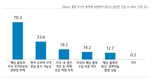 관세 추가 조치가 232조 목적에 부합하지 않는 이유로는 ‘국가안보와 무관’(70.3%)이 가장 많이 꼽혔다. 이어 ‘현지 소비자 가격 부담 증가 가능성’(33.6%), ‘미국 내 생산 역량 부족’(19.2%) 등의 의견이 있었다.