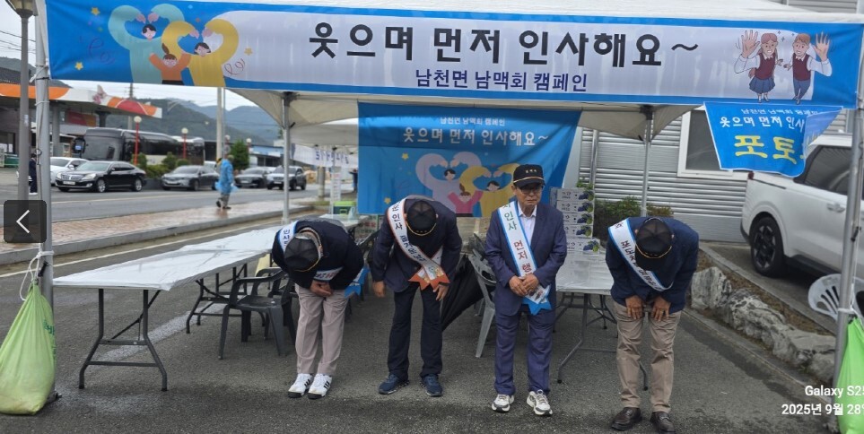 지난 2018년 발족한 남천 지역 주민들의 친목 모임인 남맥회는 지난달 28일 열린 제10회 남천면 머루포도 축제에서 포토존을 만들어 ‘인사는 내가 먼저’ 캠페인을 펼쳤다.