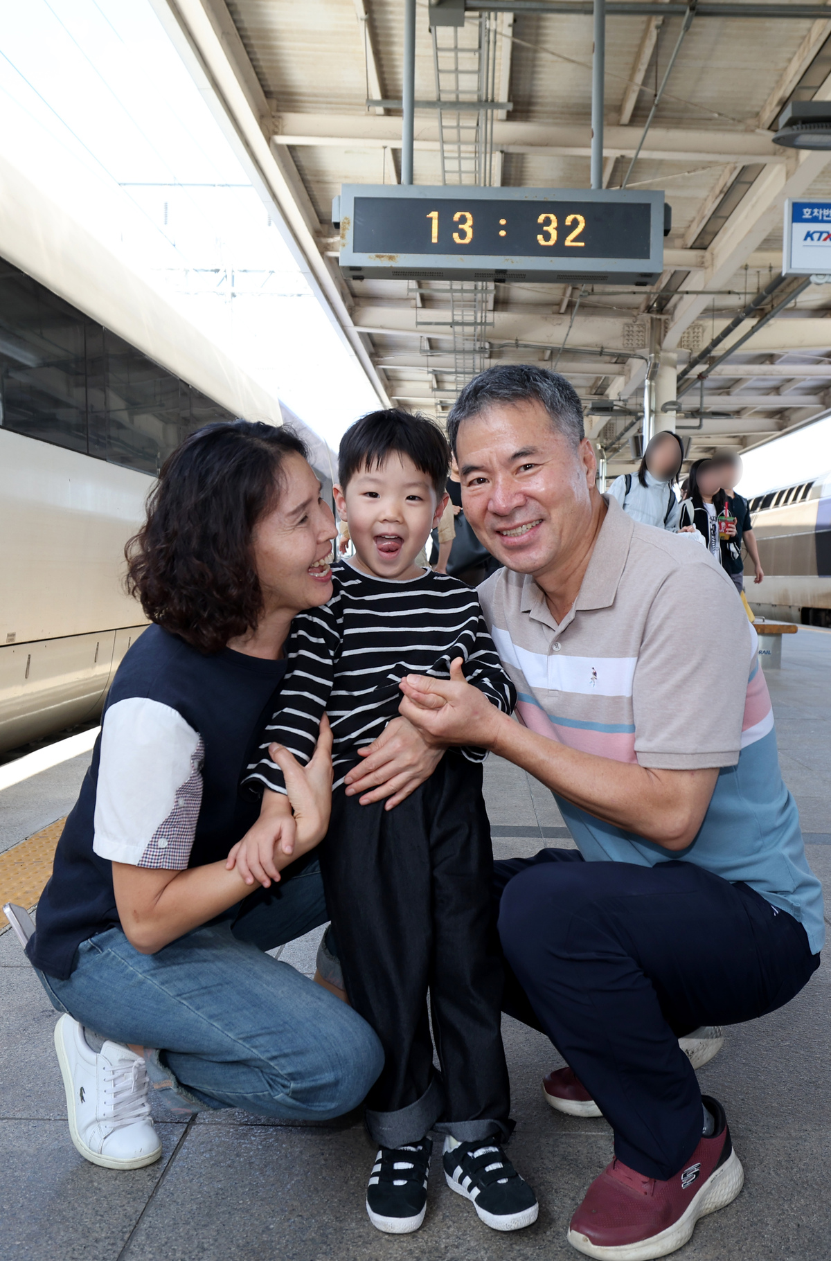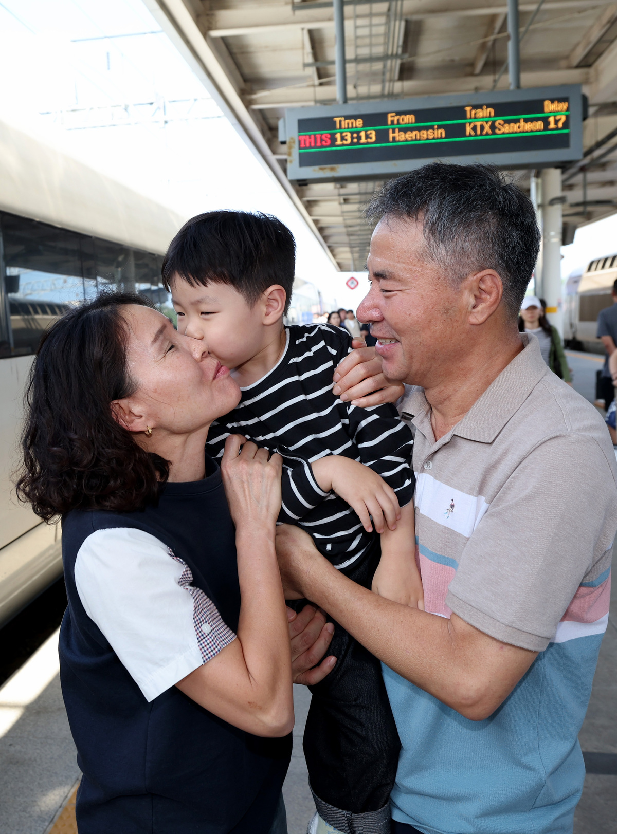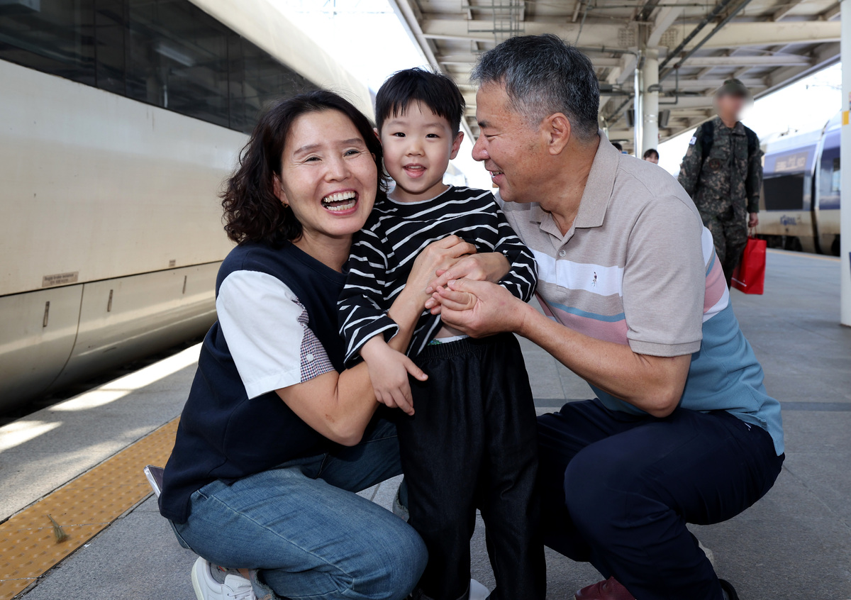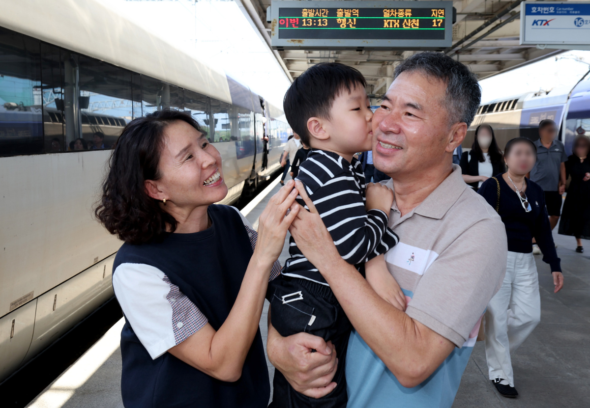 긴 추석 연휴의 시작을 이틀 앞둔 1일 오후 이른 귀성이 시작된 가운데 포항역에 아들과 손자를 마중 나온 부부가 오랜만에 만나는 손자를 반갑게 맞이하고 있다. /이용선기자 photokid@kbaeil.com