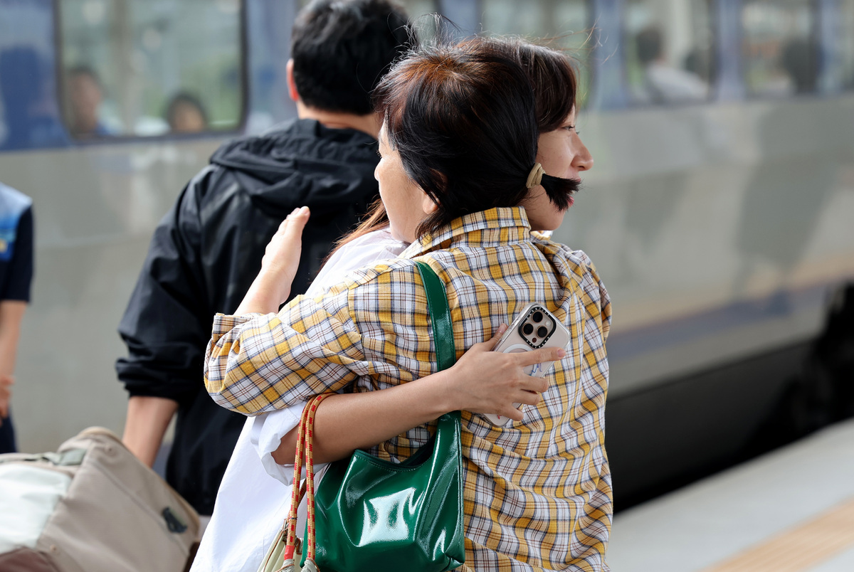 추석 연휴 마지막 날인 9일 오전 포항역에 가족을 배웅 나온 시민들이 아쉬운 작별을 하고 있다. /이용선기자 photokid@kbmaeil.com