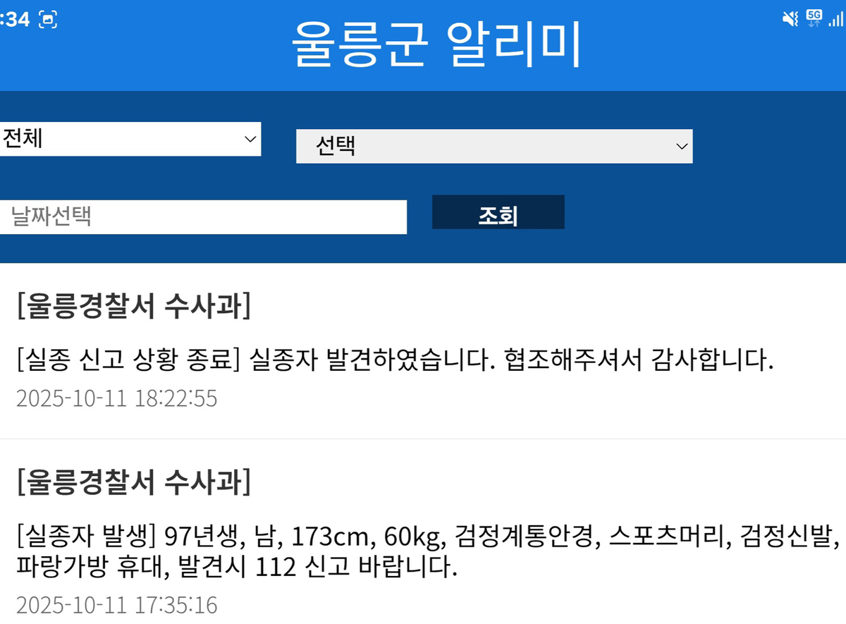 울릉경찰 관계자는 “주민들의 신속한 제보와 협조 덕분에 실종자를 무사히 가족 품으로 돌려보낼 수 있었다”며 “앞으로도 지역사회와 함께 촘촘한 안전망을 구축하겠다”고 말했다.