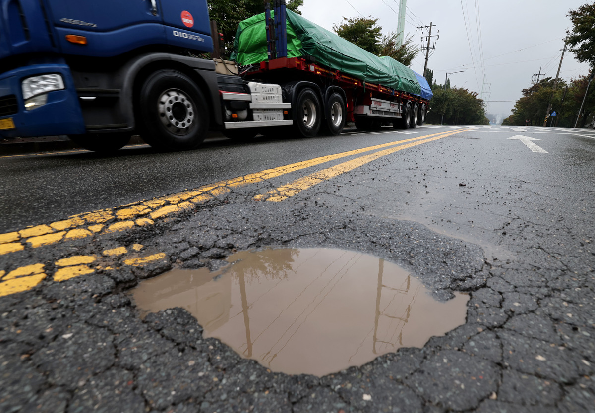 추석 연휴부터 이어진 긴 가을비로 도로 곳곳에 포트홀이 발생하면서 운전자의 안전이 위협받고 있다. 사진은 13일 오후 포항시 남구 철강 공단 도로에 발생한 포트홀. /이용선기자 photokid@kbmaeil.com