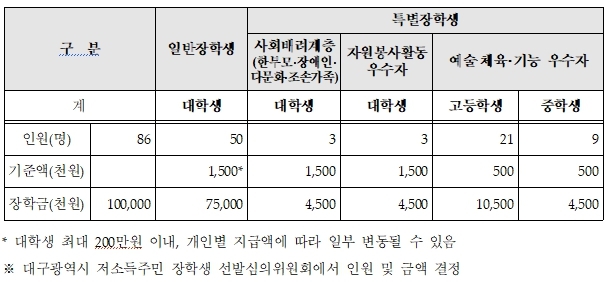모집 대상은 공고일 기준 대구시에 주소를 둔 중·고등학생 30명, 대학생 56명 등 총 86명이다. 중·고등학생은 예술·체육·기능 분야 전국대회(광역시·도 규모 이상) 수상 경력이 있어야 하며, 대학생은 성적우수자 또는 사회배려계층·자원봉사 우수자로 구분해 선발한다.