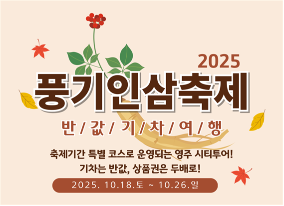 코레일 경북본부는 2025년 영주풍기 인삼축제 기간 중 ‘지역사랑 영주 2025 영주풍기인삼축제 반값 기차여행’ 상품을 판매한다.