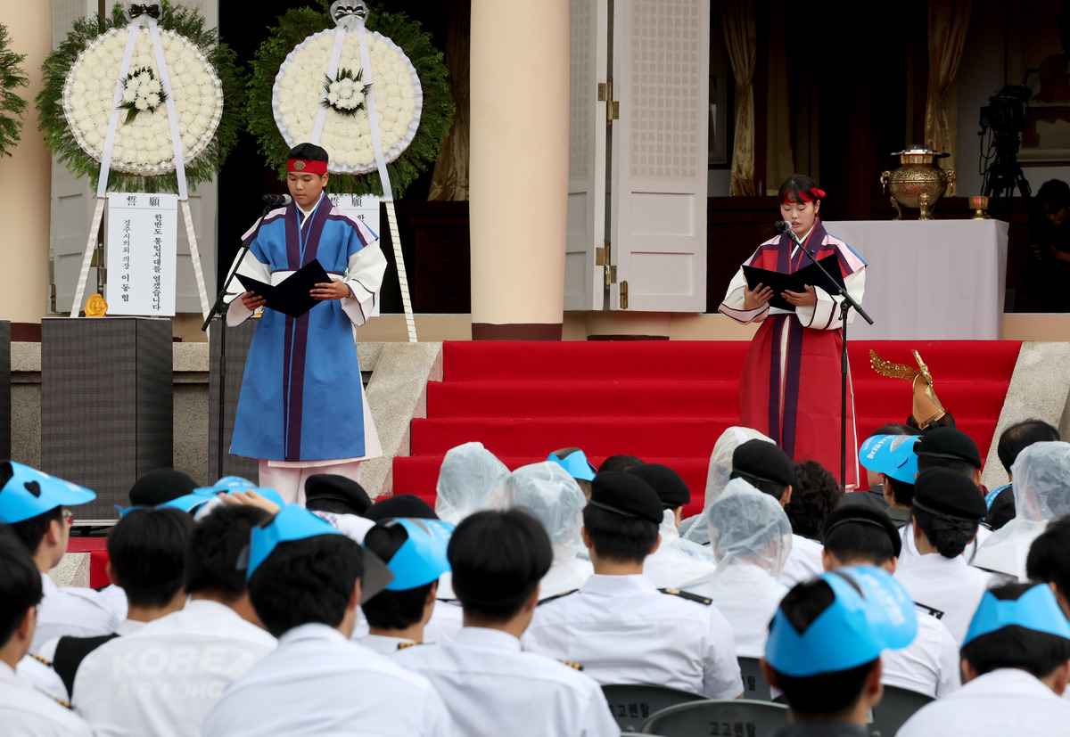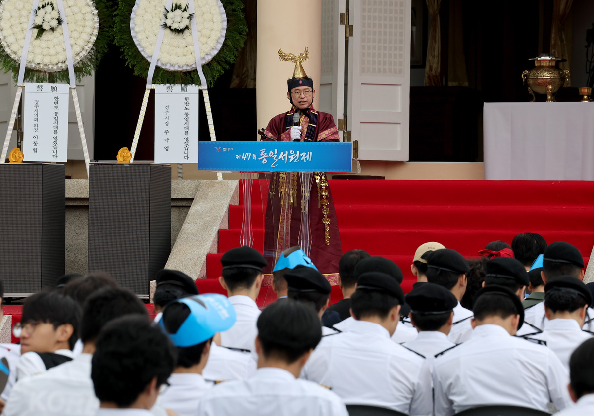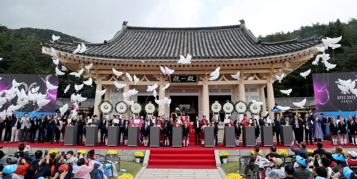 APEC 성공개최의 염원을 담은 제47회 통일서원제가 15일 오전 경주 통일전에서 열렸다. 이철우 경북도지사, 주낙영 경주시장을 비롯한 내빈과 시민 대표들이 비둘기 풍선을 날리며 APEC 성공 기원 퍼포먼스를 하고 있다. /이용선기자 photokid@kbmaeil.com