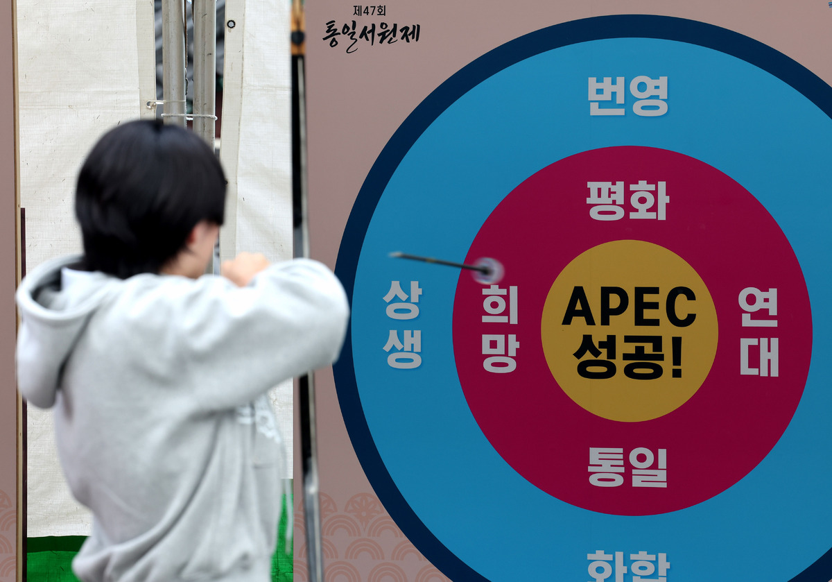 APEC 성공개최의 염원을 담은 제47회 통일서원제가 15일 오전 경주 통일전에서 열렸다. 이철우 경북도지사가 행사장에 마련된 활쏘기 체험장에서 APEC 성공개최 과녁을 정조준하고 있다. /이용선기자 photokid@kbmaeil.com
