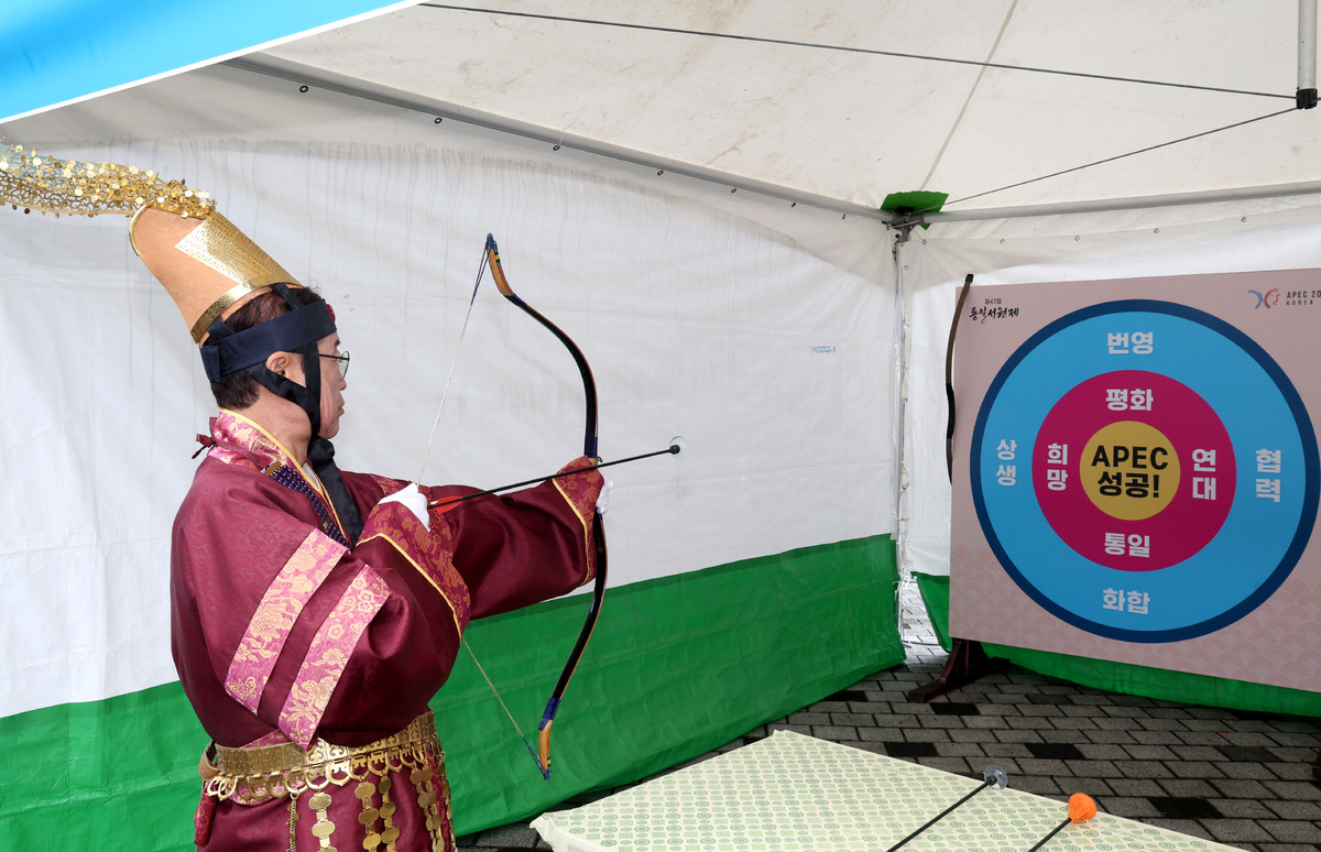 행사장에 마련된 활쏘기 체험장에서 참가자가 APEC 성공개최 과녁을 정조준하고 있다.
