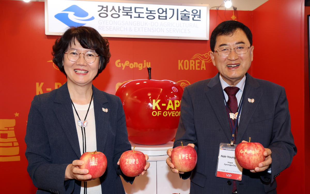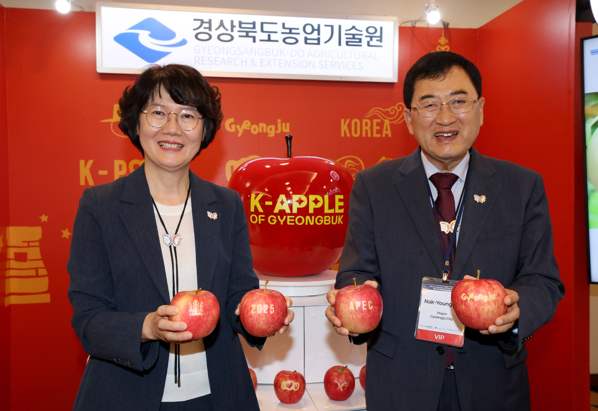 16일 오후 주낙영 경주시장(오른쪽)과 조영숙 경북농업기술원장이 경주 힐튼호텔에 마련된 투자 홍보 부스에서 APEC 기념 홍보 문자 사과를 보여주고 있다. 이 사과는 경북 농업기술원에서 사과 착색 시기에 문자 테이프를 붙여 한 달여 동안 만든 사과이다. 테이프를 붙이는 부분은 햇빛이 가려져 생기는 현상이다. /이용선기자 photokid@kbmaeil.com