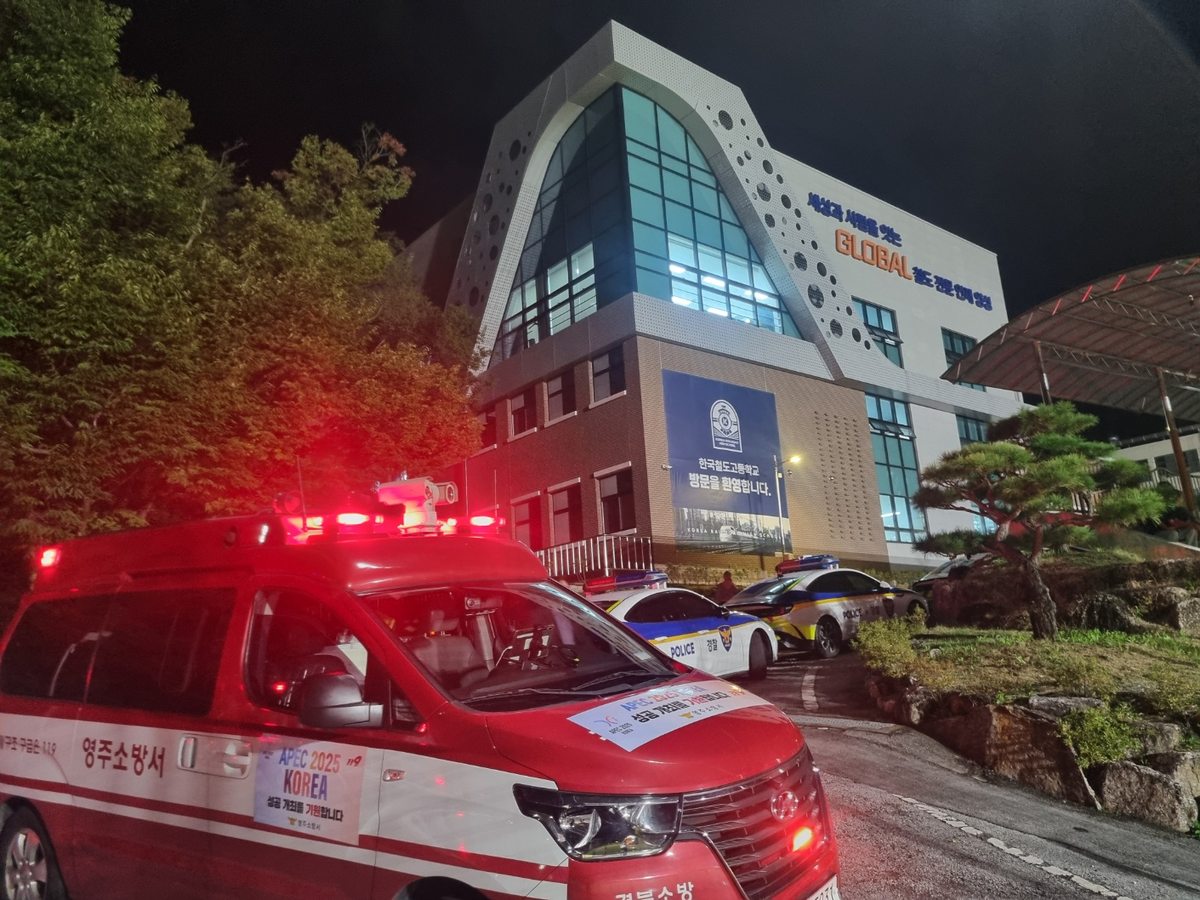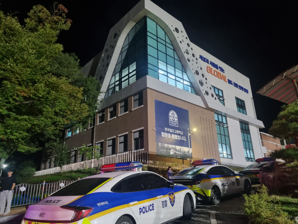 속보)16일 영주시 소재 한국철도고등학교를 폭파하겠다는 내용을 접수한 영주경찰서와 영주소방서는 함께 출동해 비상시를 대비한 메뉴얼에 따라 학교 주변과 교내 수색작업을 펼쳤다.