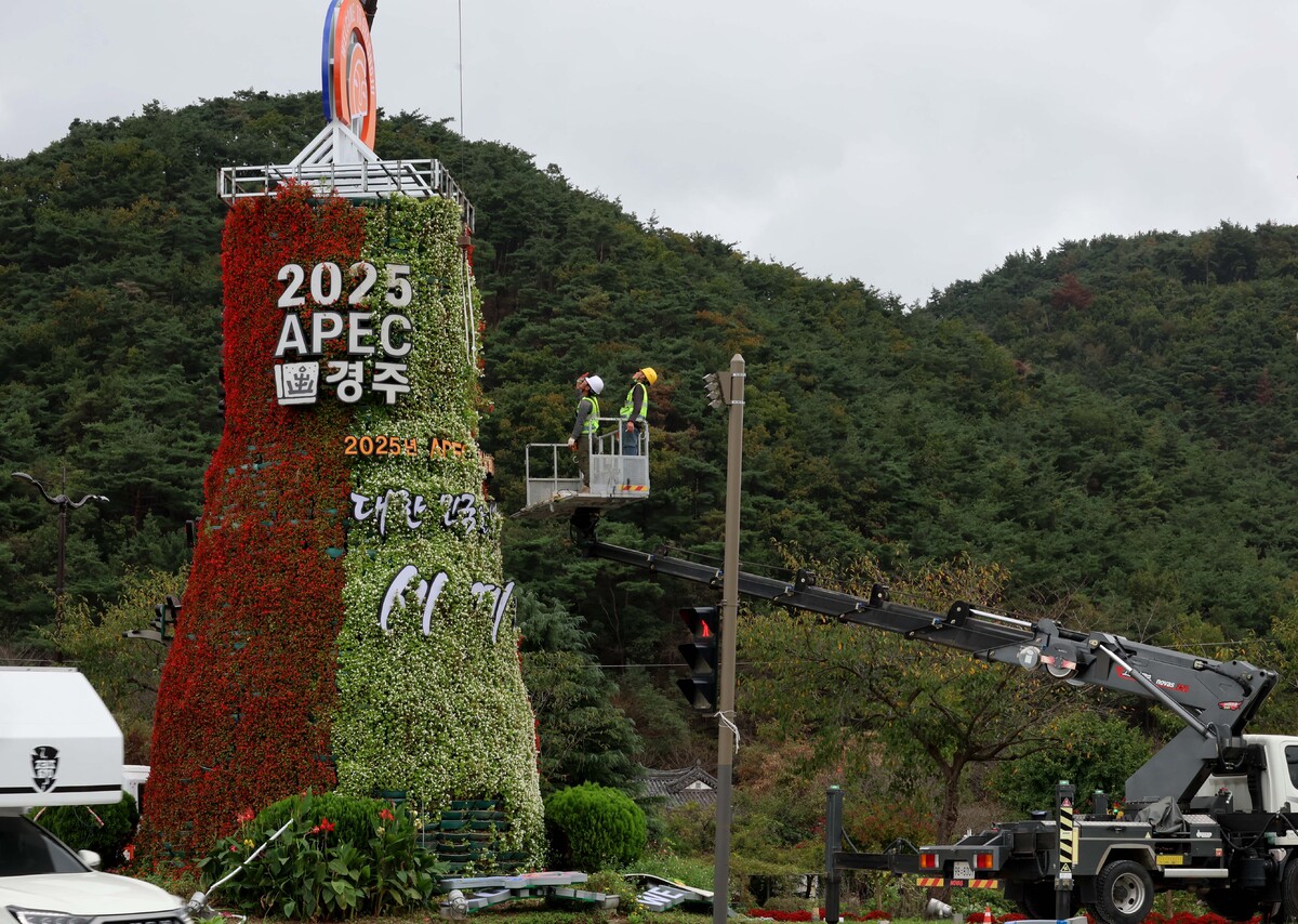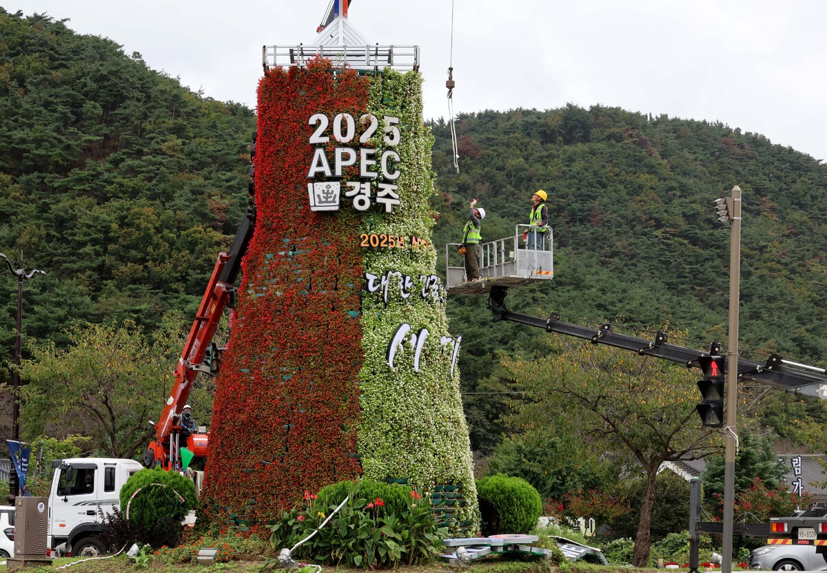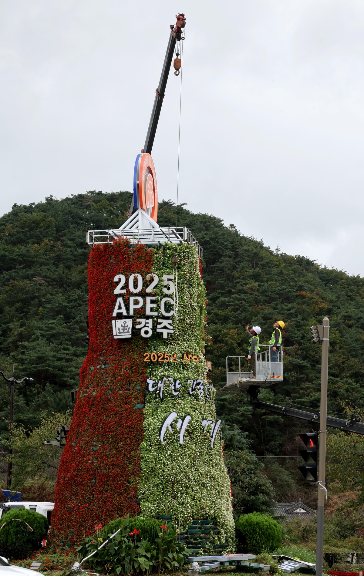 APEC 정상회의를 열흘 여 앞둔 19일 오후 경주 보문관광단지 입구에 만들어진 홍보 꽃탑을 정비하고 있다. /이용선기자 photokid@kbmaeil.com