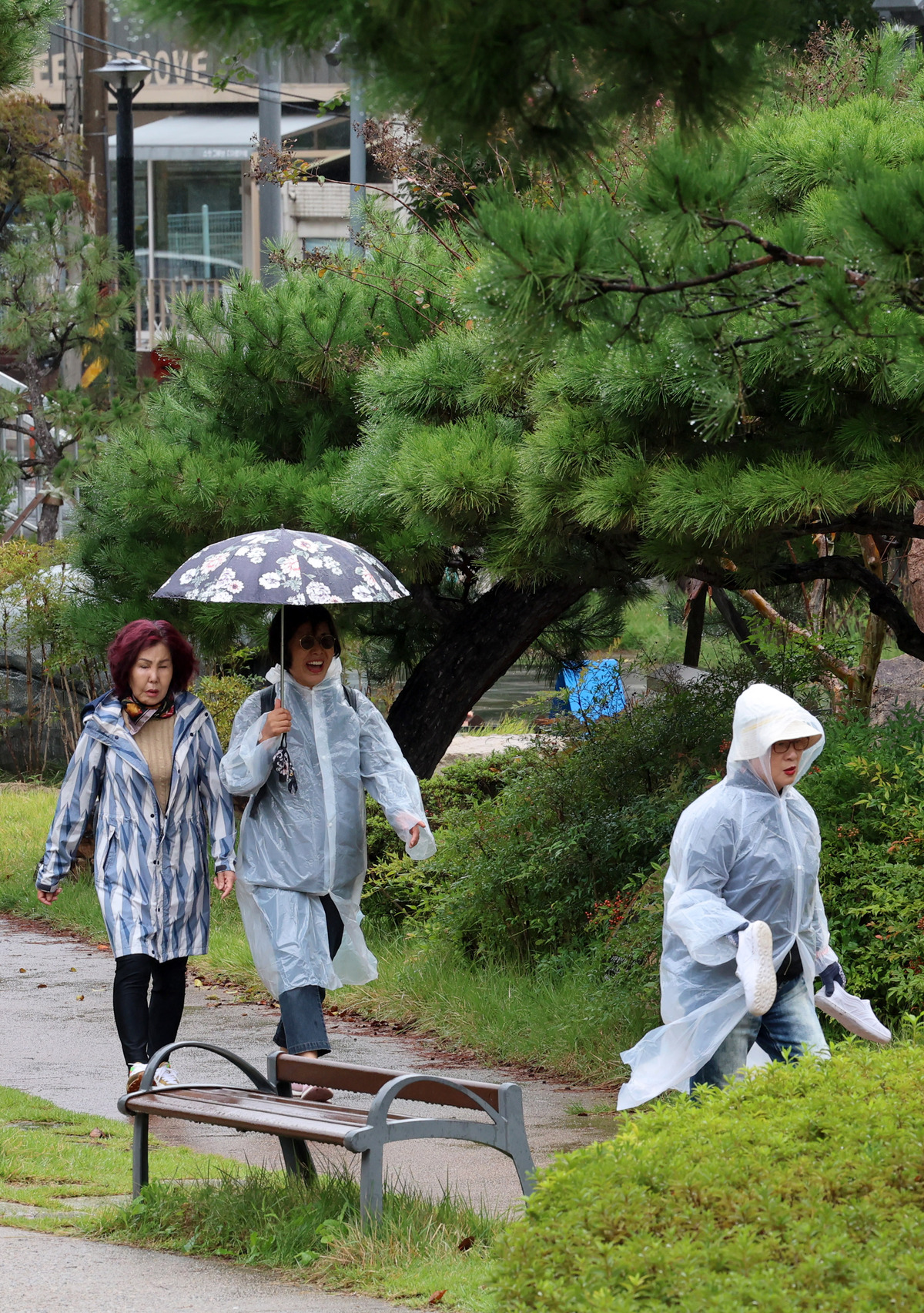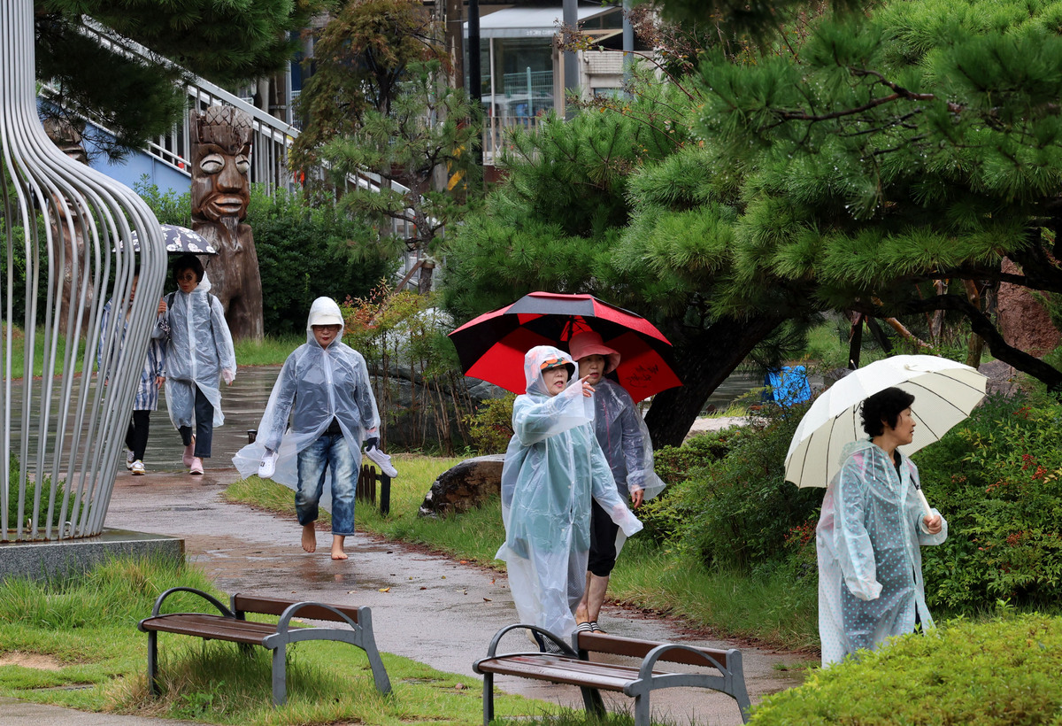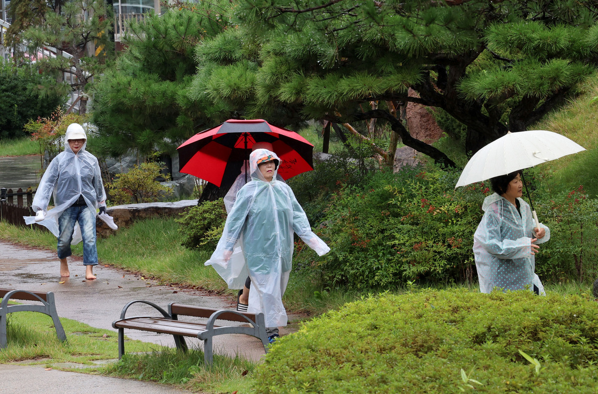 가을 장마가 지겹도록 이어진 20일 오전 포항시 남구 대잠동 철길숲에서 시민들이 우중 산책을 즐기고 있다. /이용선기자 photokid@kbmaeil.com