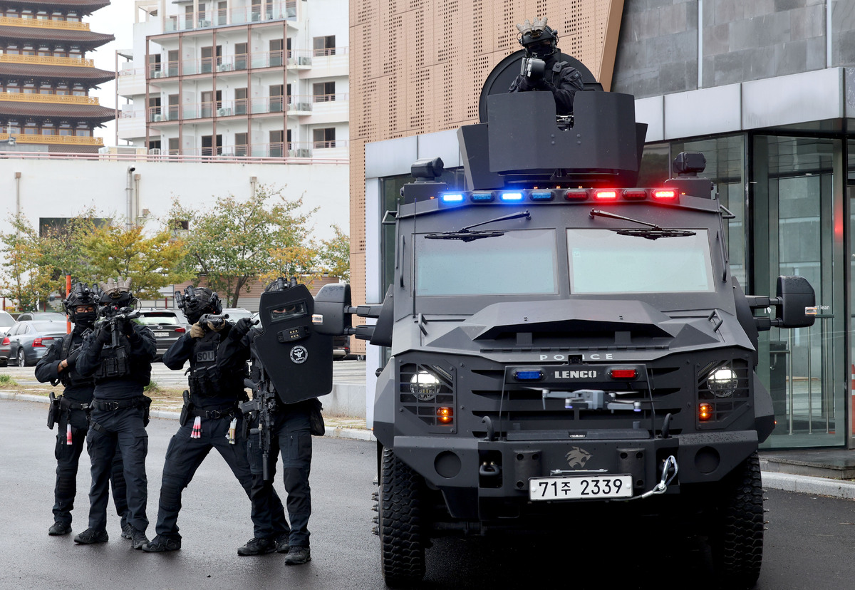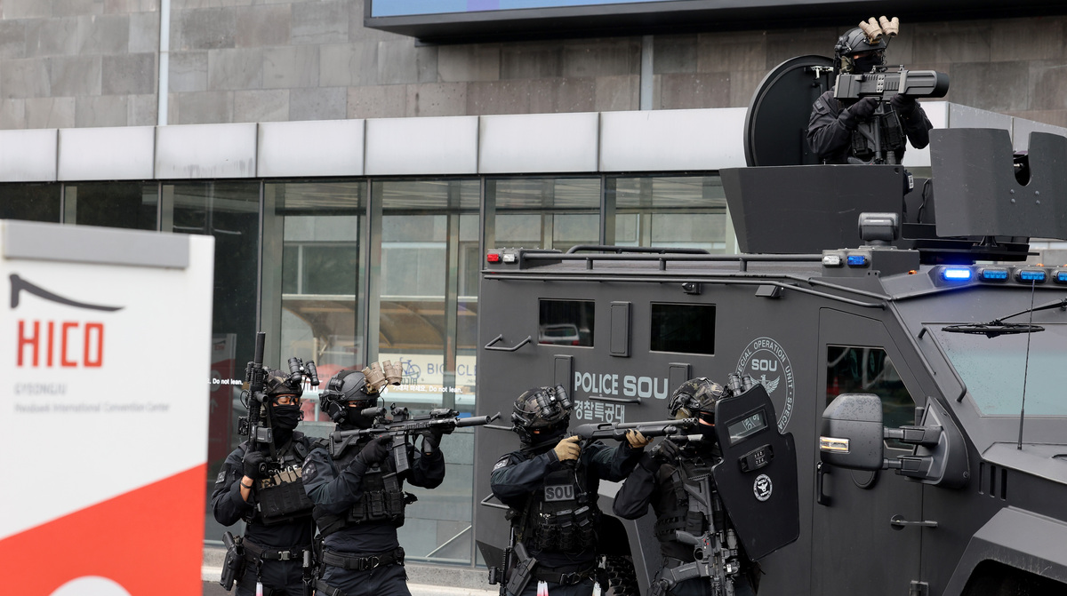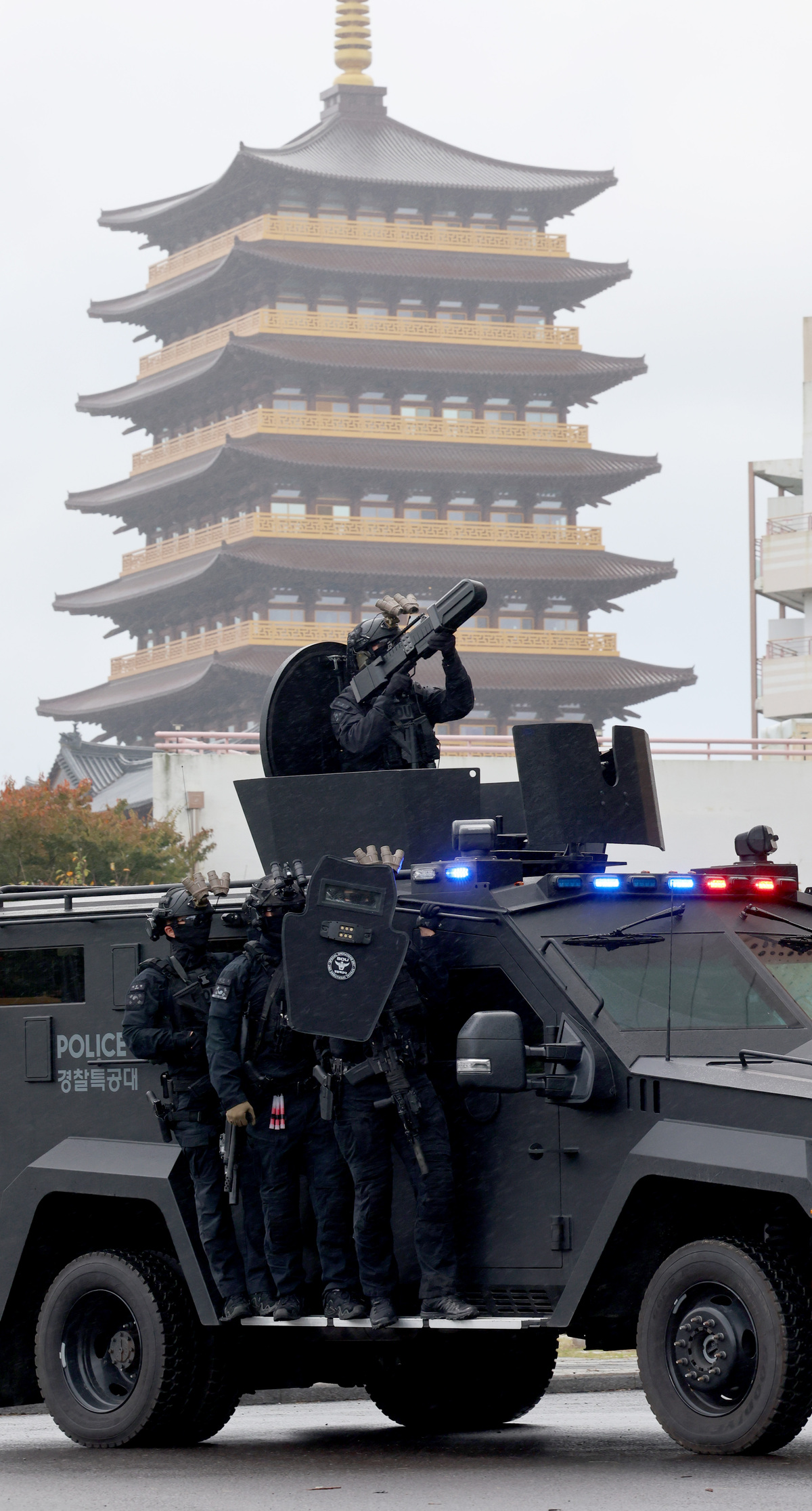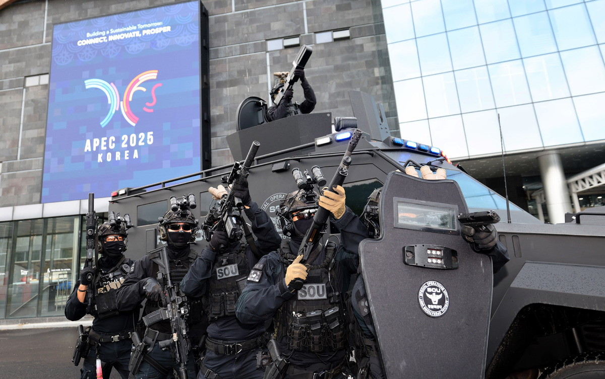 APEC 정상회의를 열흘 앞둔 20일 오후 정상회의장인 경주 화백 컨벤션 센터에서 경찰 특공대원이 드론 공격 등에 대비한 대테러 훈련을 시행하고 있다. /이용선기자 photokid@kbmaeil.com