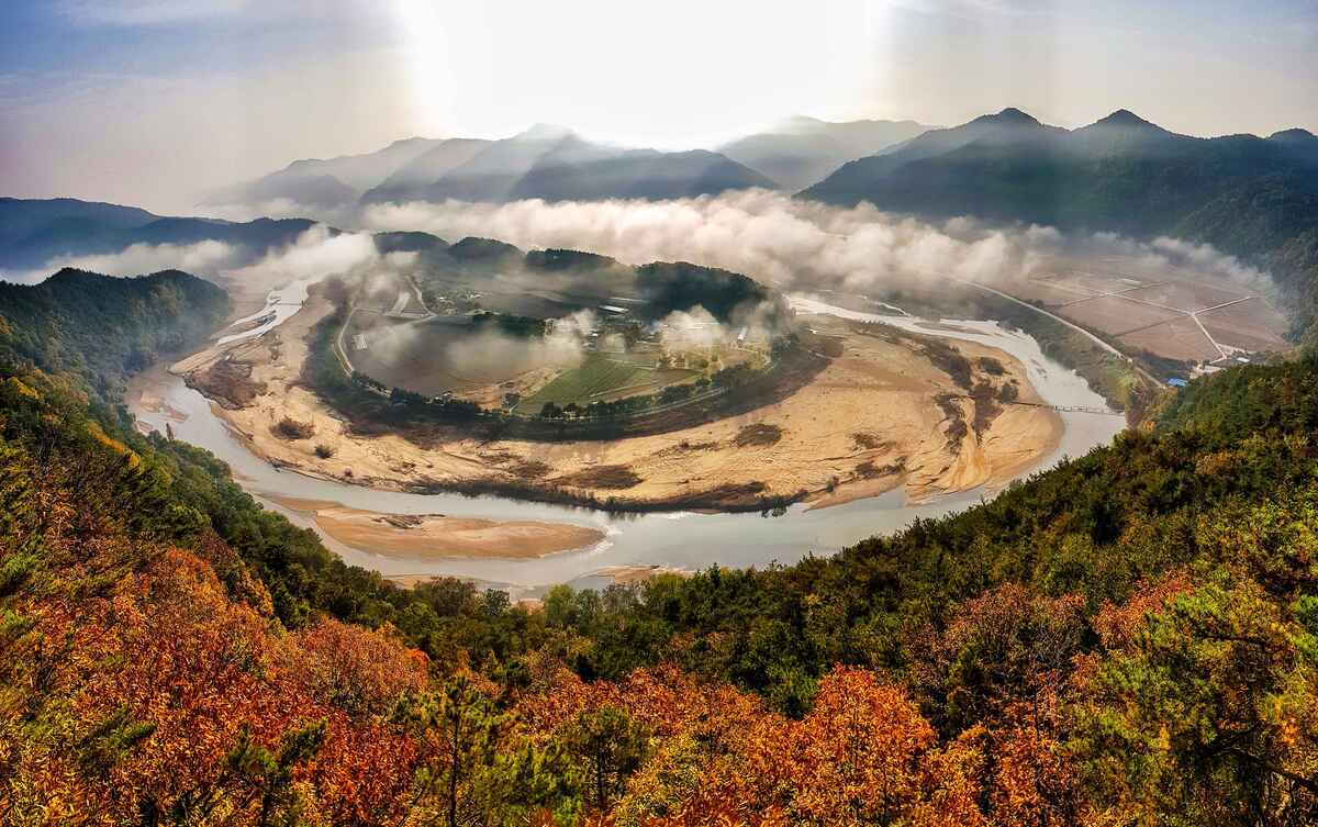 예천군 용궁면에는 낙동강 물돌이동 마을인 회룡포가 있다. 내성천이 마을을 휘감아 돌아가는 육지 속의 섬 같은 마을은 드라마 ‘가을동화’의 촬영지로 그림 같이 아름답다. 물길이 마을을 품은 풍경을 제대로 감상하려면 마을 건너편 비룡산 전망대인 회룡대에 올라야 한다. 전망대에서 내려다보면 용이 날아오르면서 크게 한 바퀴 돌아간 자리에 강물이 흘러 만들어졌다는 옛이야기가 저절로 이해된다. 한여름의 초록빛도 아름답지만 황금빛으로 물드는 가을이 오면 회룡포는 화양연화처럼 가장 아름다운 빛을 낸다.