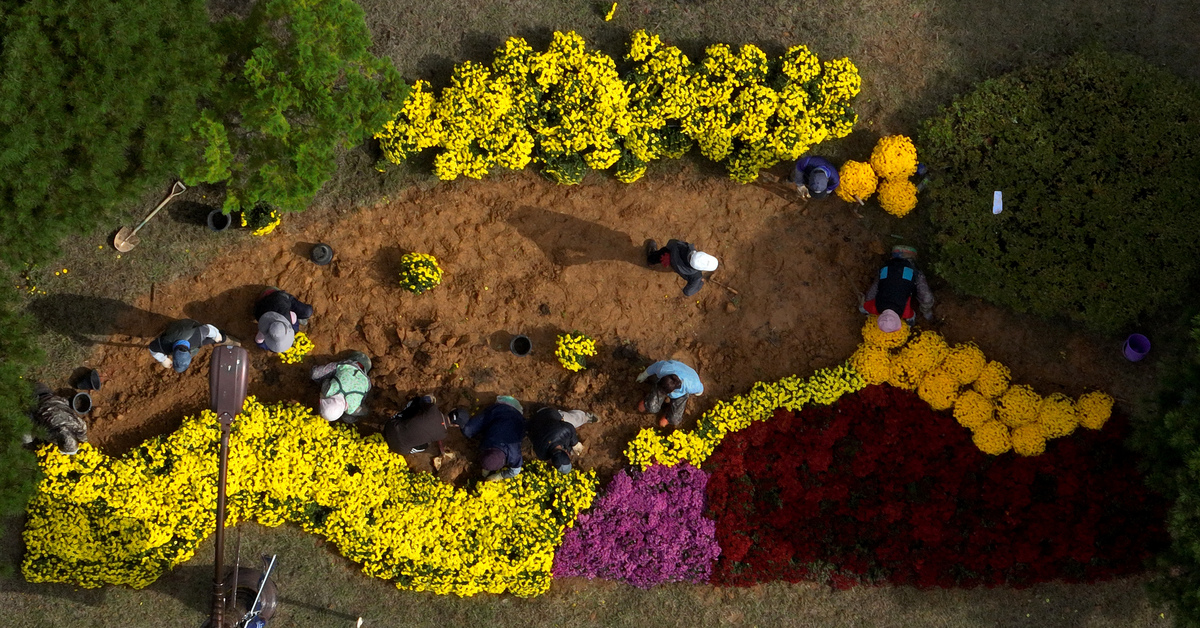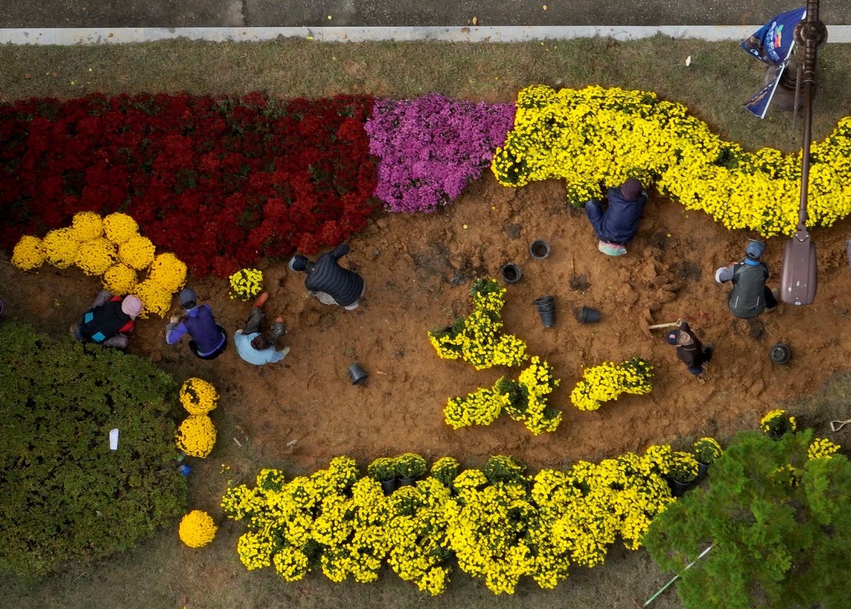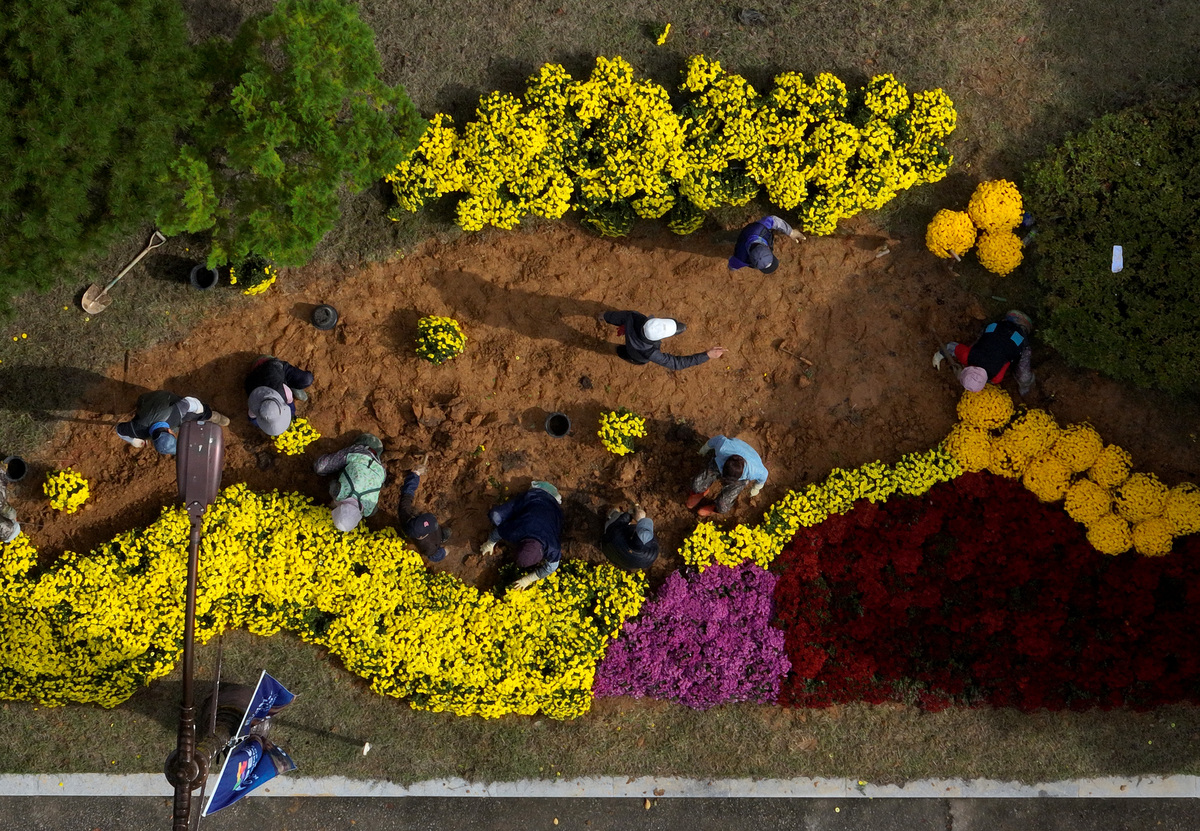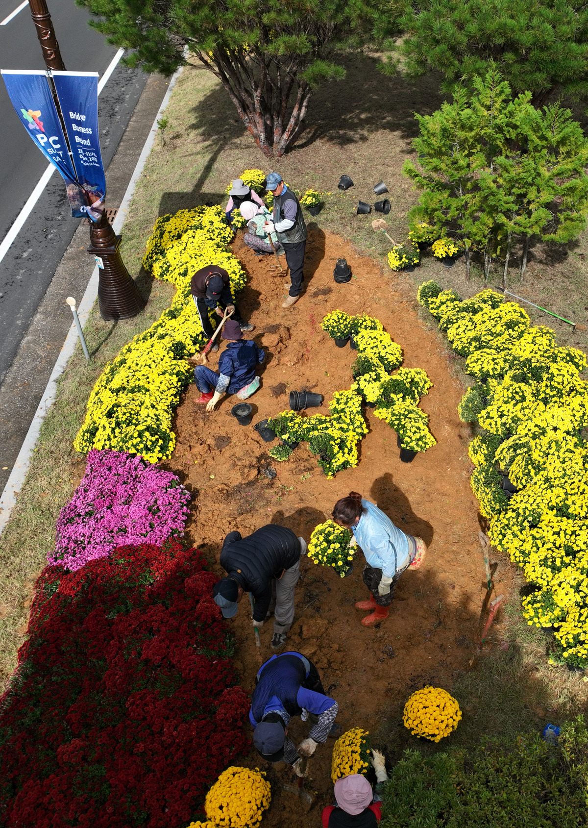 23일 오전 APEC 정상회의가 열리는 경주 보문관광단지 순환도로 화단에 형형색색의 국화꽃을 심으며 손님맞이 막바지 준비가 한창이다. /이용선기자 photokid@kbmaeil.com