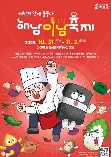 전남 해남군은 오는 31일부터 11월 2일까지 삼산면 두륜산 도립공원 일대에서 ‘미남축제’를 개최한다고 24일 밝혔다. ‘해남의 맛에 물들다’를 주제로 열리는 이번 축제는 지역 농수산물과 음식을 활용해 해남의 맛과 문화를 알리는 행사다.