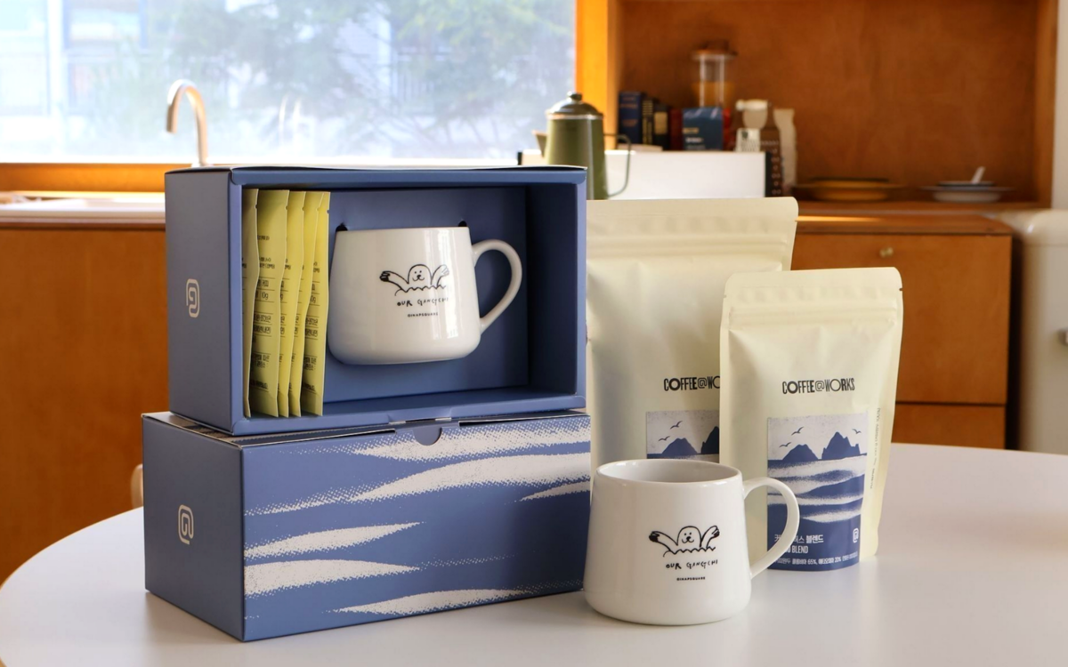 이번 협업을 통해 커피앳웍스는 독도문방구의 디자인을 활용한 기념 굿즈도 함께 선보였다. 멸종된 독도 바다사자 ‘강치’를 일러스트로 담은 머그컵과 드립백이 세트로 구성된 굿즈 패키지는 커피앳웍스 매장 및 독도문방구 오프라인·온라인몰에서 구매할 수 있다. 구매 고객에게는 서준범 한국화 작가의 독도 수묵채색화 엽서가 한정 증정된다.