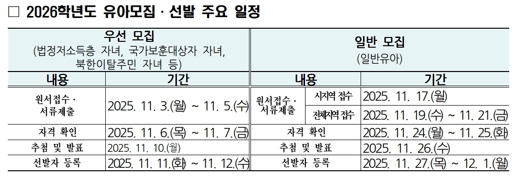 모집은 △우선모집(11월 3~5일) △일반모집(11월 17~21일) △추가모집(12월 2~2026년 2월 13일) 3단계로 진행된다. 우선모집은 기존 재원생, 법정저소득층 등 특별 대상자로 진행되며, 일반모집은 전체 유아를 대상으로 한다. 추가모집은 정원 미달 유치원에 한해 수시 접수·발표한다.