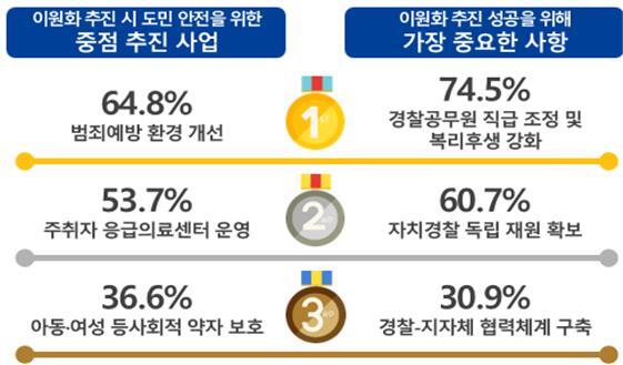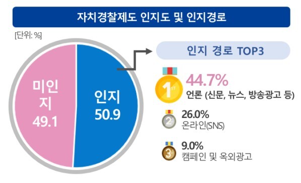 조사 결과 자치경찰제 인지도는 지난해 31.9%에서 올해 50.9%로 19%포인트 상승했다. 자치경찰제를 알게 된 경로로는 ‘언론’이 44.7%로 가장 많았고, 선호하는 홍보 수단으로는 SNS 등 온라인 매체가 41.7%로 가장 높게 나타났다.