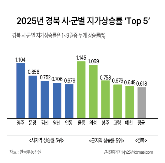 한국부동산원 통계자료를 분석해본 결과, 경북 도내 시군별 지가상승률(1~9월 누계) 가운데 시지역의 경우에는 1위 영주시(1.104%), 2위 문경시(0.856%) 3위 김천시(0.752%) 4위 영천시(0.706%) 5위 안동시(0.679%) 순으로 상위 5위를 차지했다.